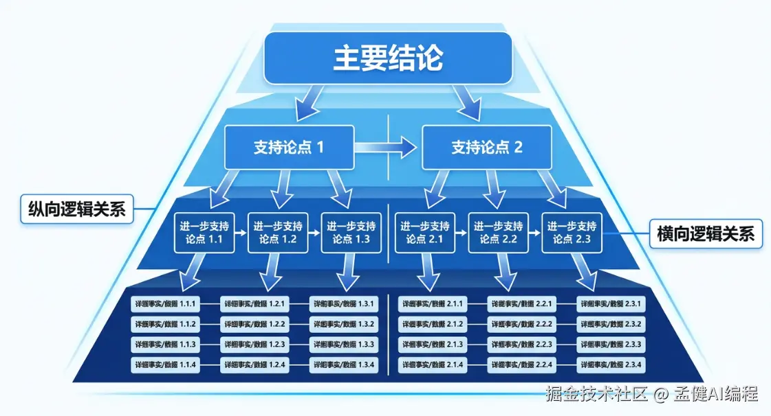 在纵向上,是一种层次关系,上一层思想是下一层思想的概括,下一层是对上一层的解释和支持。它的核心就是结论先行、以上统下。