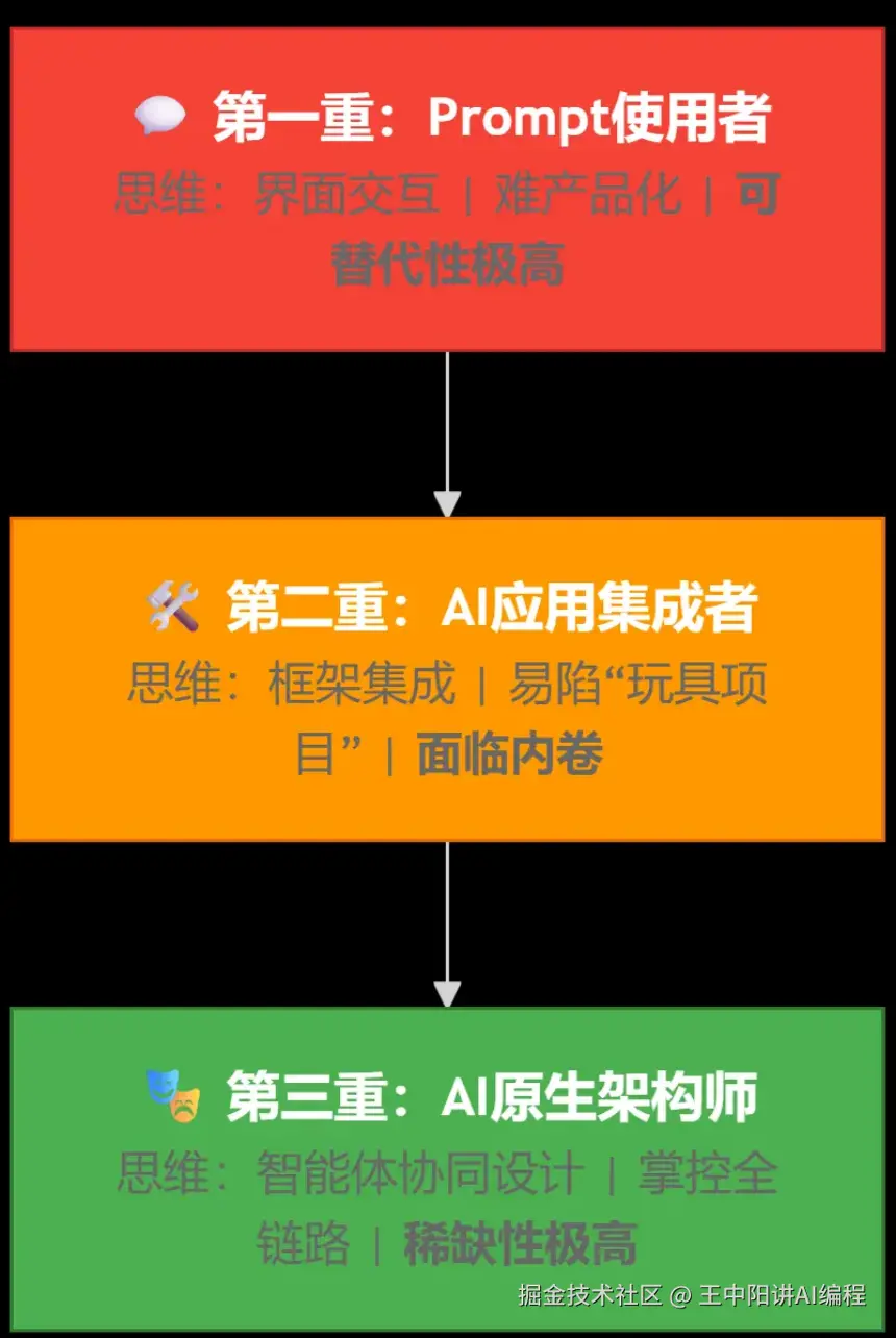 - 第二重:AI应用集成者:能用LangChain等快速搭Demo,但易陷入 “玩具项目”陷阱,面对生产环境的幻觉、高延迟、高成本问题手足无措。状态:焦虑的“缝合者”。