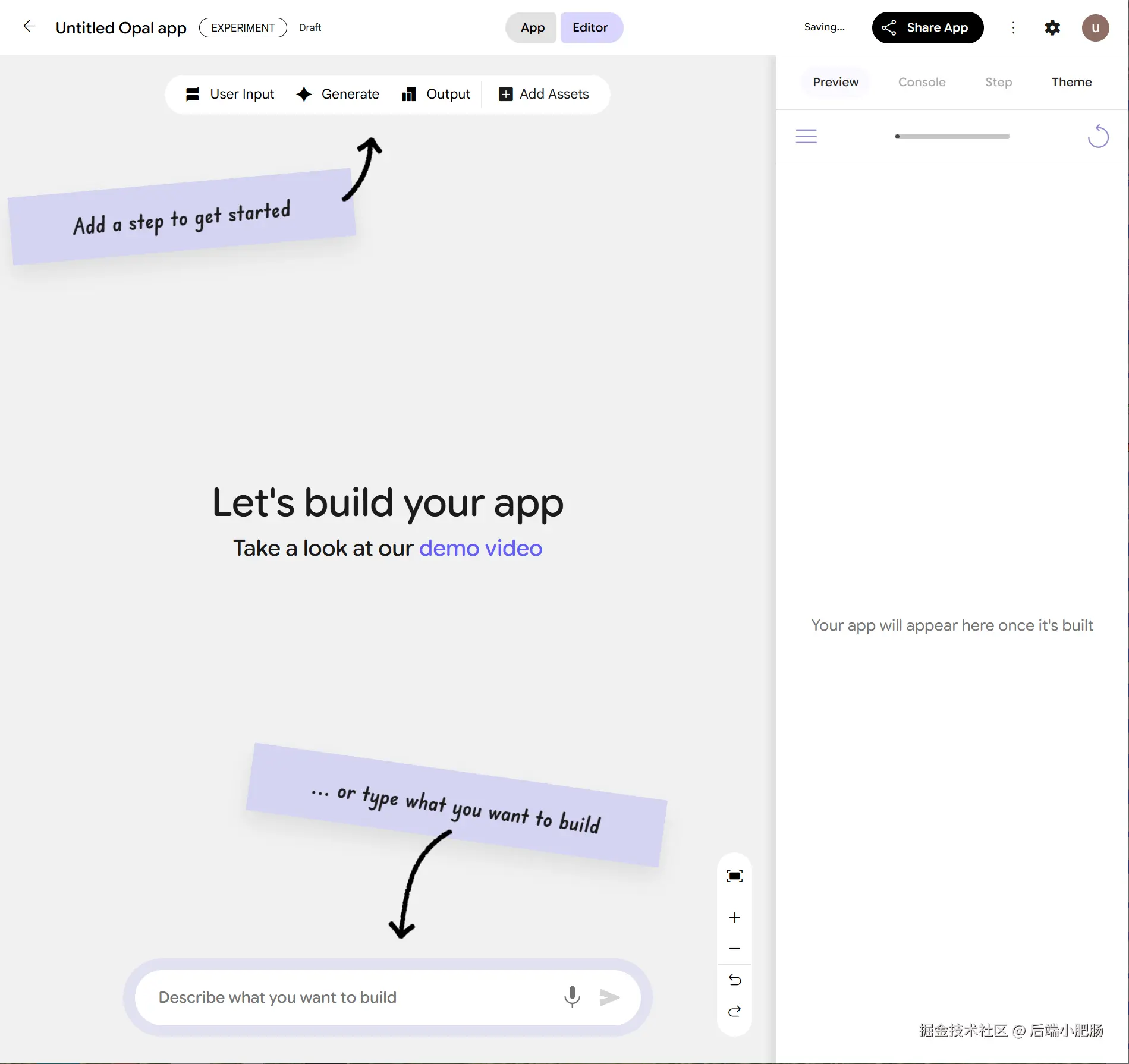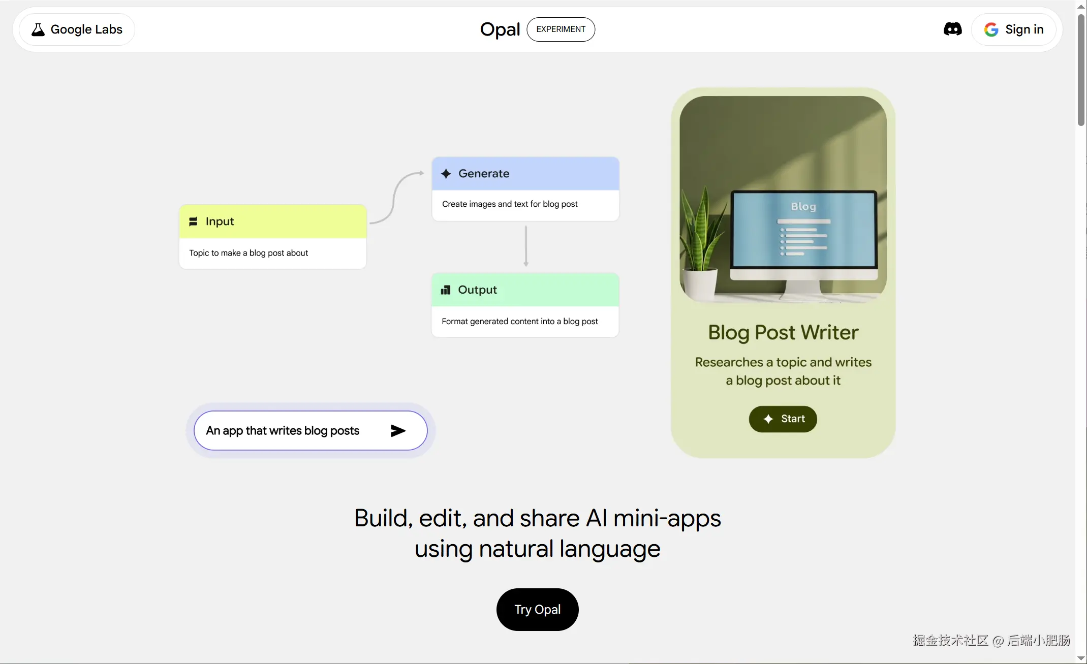 出于技术人的敏感,我立马去扒了一下它的背景:原来这玩意儿 Google 早在今年 7 月就发布了,只是当时比较低调。 但最近随着 AI 能力的迭代,它又在开发者圈子里火了一把。什么是 Opal? 简单来说,Opal 是谷歌推出的可视化应用构建平台。它最大的噱头就是 "Prompt to App" ——你不需要拖拽复杂的节点,只需像聊天一样说出需求,它就能自动生成包含后端逻辑和前端界面的完整应用。
