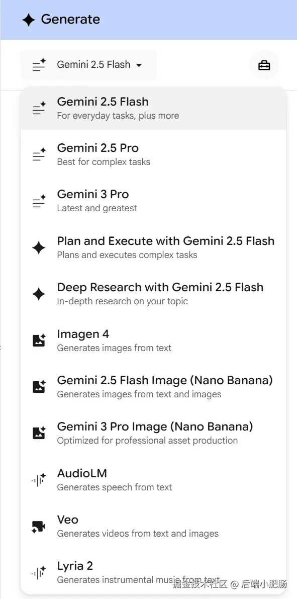 更厉害的是,Opal 可以调用谷歌家一众神仙模型,包括语言模型 Gemini 2.5 Flash、Gemini 2.5 Pro、Gemini 3 Pro,图像生成模型 Imagen 4、Gemini 2.5 Flash Image (Nano Banana)、Gemini 3 Pro Image (Nano Banana) ,还有音频模型 AudioLM,视频模型 Veo,以及音乐模型 Lyria 2。