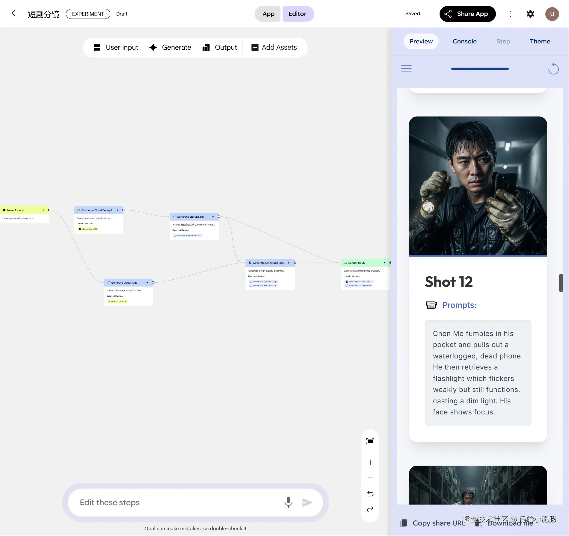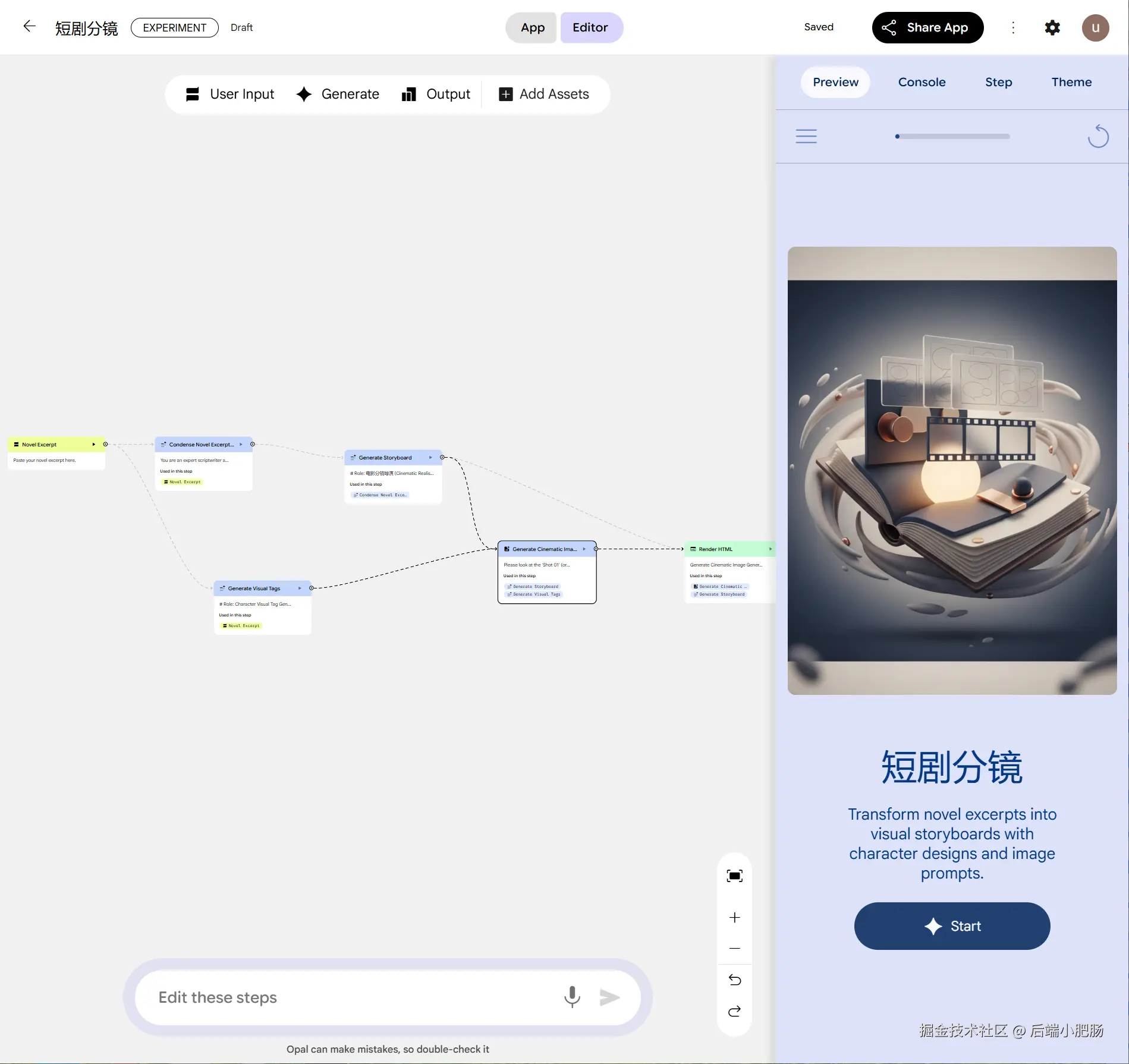 今天的实战就到这里。通过 Google Opal,我们只用了几分钟的时间,仅仅通过自然语言的描述,就构建出了一个包含剧情理解-角色提取-分镜绘制-网页展示的完整应用。