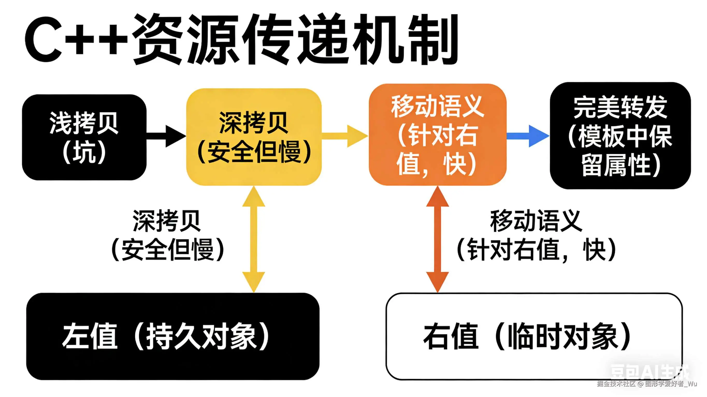 以上便是C++对象资源传递机制的主要内容,从浅拷贝、深拷贝、左值右值、移动语义、完美转发层层递进,如下图所示:
