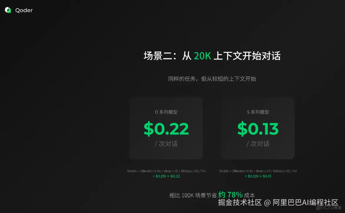 可以看出,从20K上下文开始对话与从100K上下文开始对话相比,可以节省约 78%成本。所以,如果你的新任务和历史对话无关,请务必新开一个窗口!