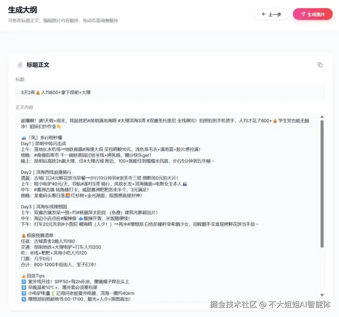 第一步,生成标题、正文、每张图的内容描述(含文案+配图)