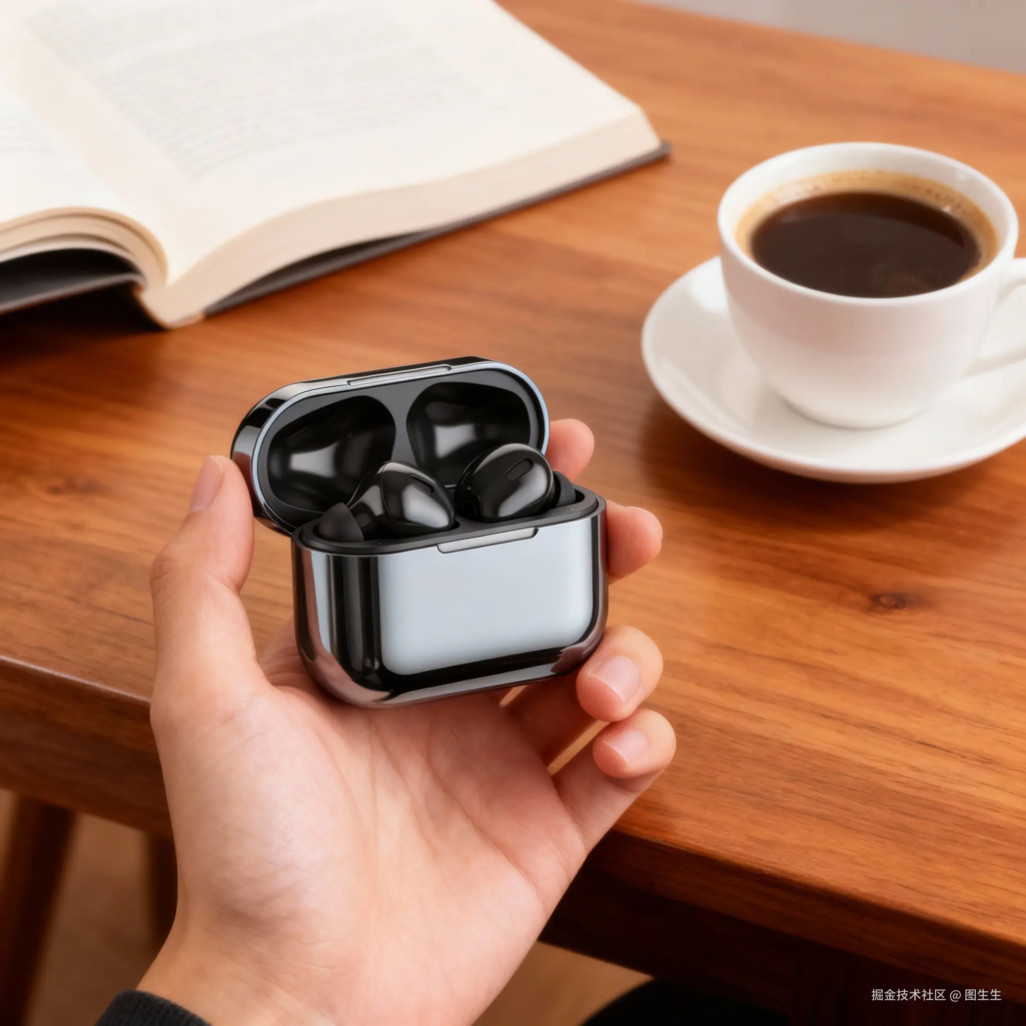 一只手握着这个蓝牙耳机充电盒,背景是木质书桌,桌上放着一杯咖啡和一本翻开的书