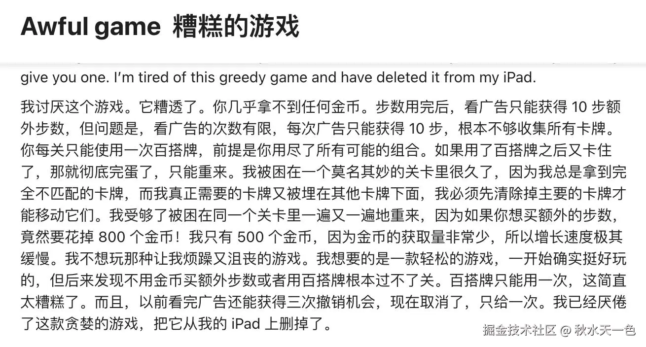 而在商业模式上,公司则坚定聚焦IAA,并搭配 “终身去广告套餐”与局内道具购买的补充变现形式。不过这一模式也带来了明显通病,旗下游戏普遍存在广告过载的问题,一定程度上影响了用户体验。