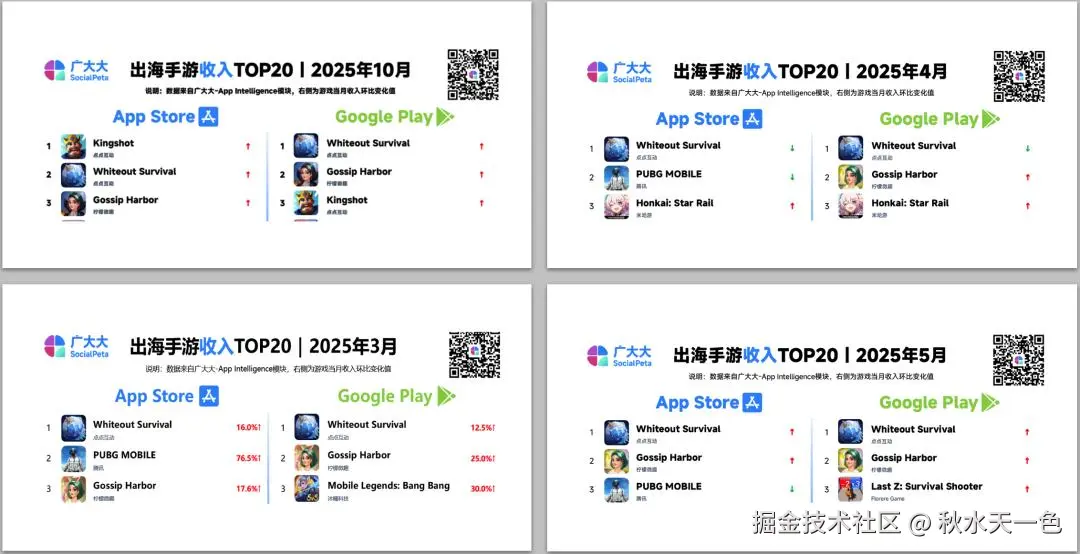 点点互动的成功与出彩以一种势不可挡的态势冲刷着每个从业者、普通玩家甚至热心股民。根据广大大每月榜单显示,【Whiteout Survival】和【Kingshot】蝉联甚至垄断了2025全年的出海手游收入冠军,羡煞一旁的二合爆款——柠檬微趣【Gossip Harbor】。