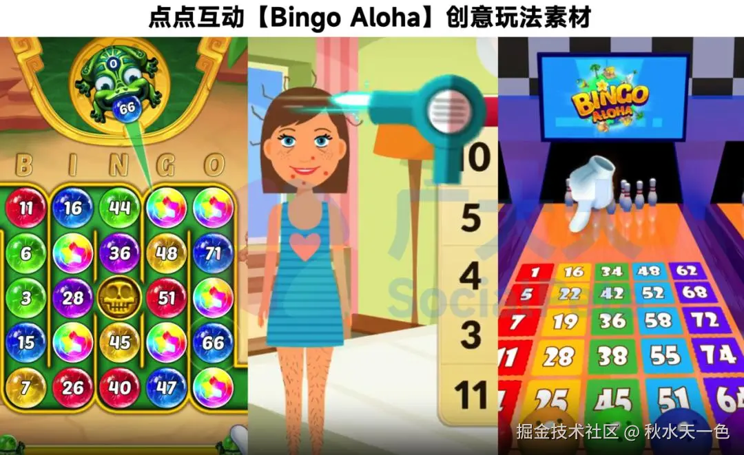 除了放置,点点互动还积极尝试了宾果、二次元等细分赛道,其中【Bingo Alohal】的玩法十分多样,将原本玩法与保龄球、青蛙祖玛、女性向化妆等玩法充分结合。