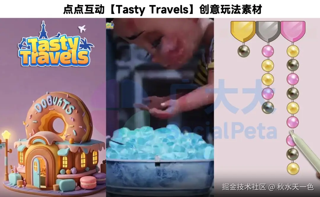 在休闲SLG赛道赢麻之后,点点互动开始向万年老二的合成消除赛道发起冲锋,美食+合成的女性向手游【Tasty Travels】靠着不断调优和稳定运营,走上了“先苦后甜”的光辉大道。买量方面更是集自家所长,AI、副玩法、女性向剧情一个没落下。根据广大大抓取素材显示,【Tasty Travels】常用副玩法有珠串排序、解绳子、合成大西瓜、泡泡龙等……