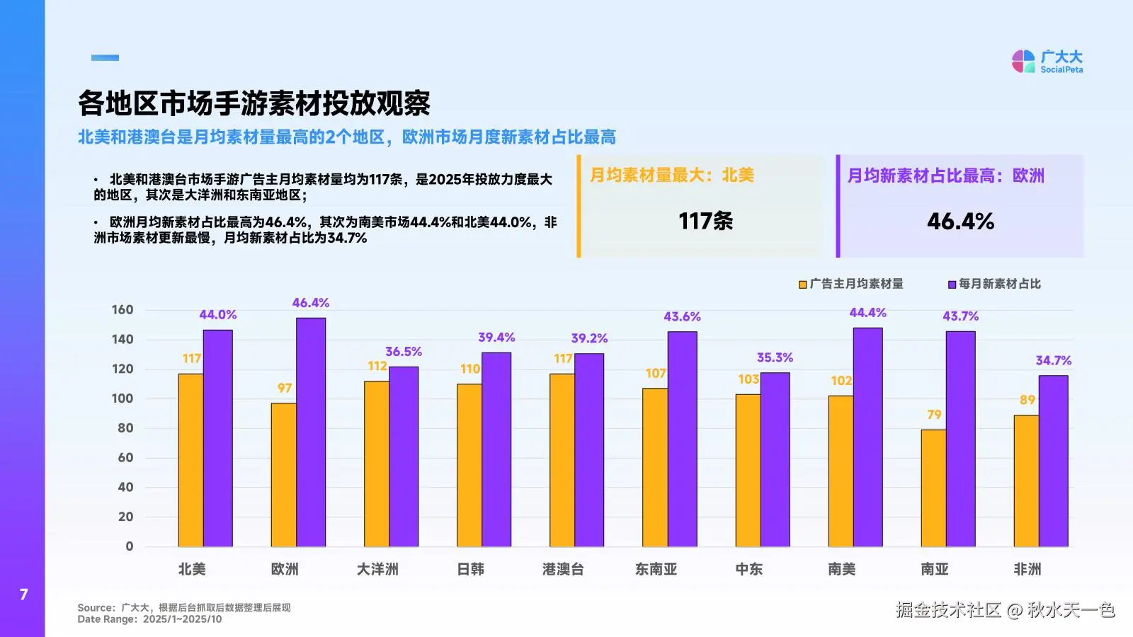 此外,大洋洲和东南亚市场的月均素材量分别达到112条和110条,位列第三、四位,成为继北美、港澳台之后的重点布局区域,其素材策略可参考北美市场的“量效兼顾”思路。