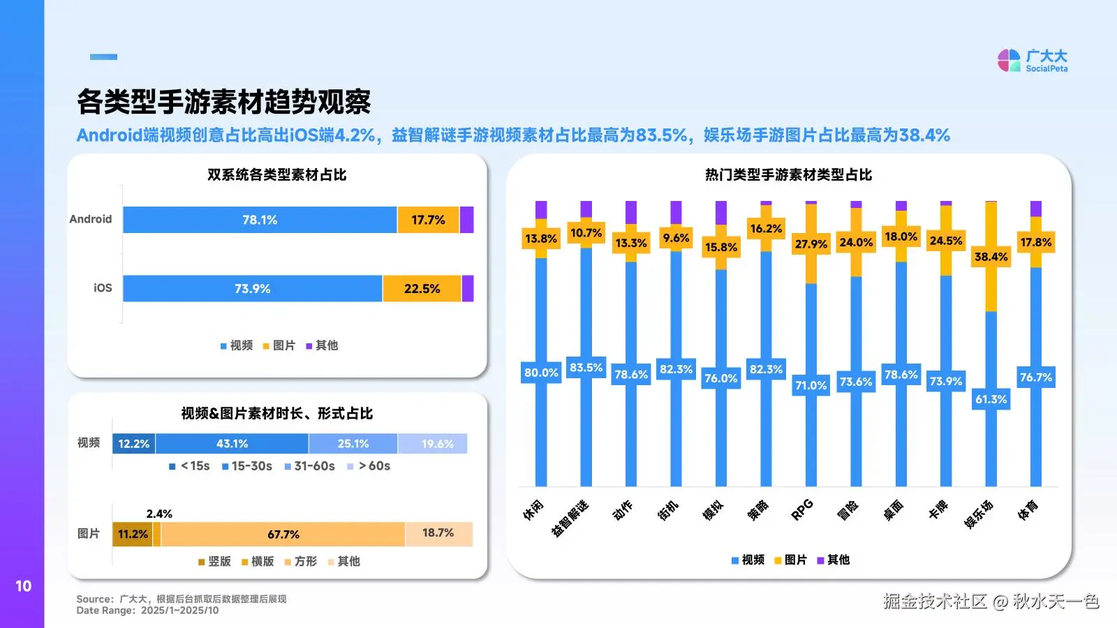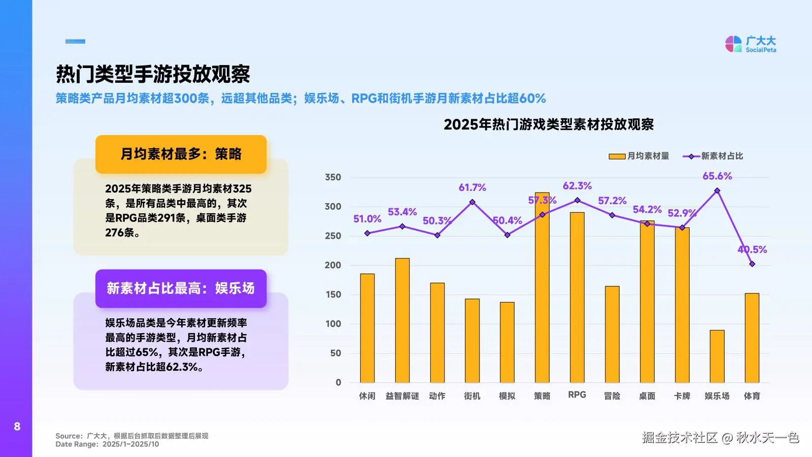 不同游戏品类的素材投放逻辑,与其用户属性、核心玩法深度绑定,报告第8页的品类数据为开发者提供了清晰的参考框架: