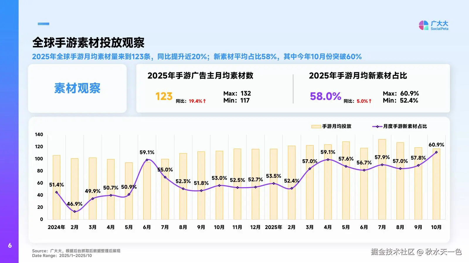 更值得关注的是新素材的迭代速度:2025年全球手游月均新素材占比高达58%,其中10月份更是突破60%,创下年内新高。这背后反映的是用户注意力的快速迭代——玩家对重复素材的容忍度越来越低,只有保持高频次的素材更新,才能持续抓住用户眼球。对于开发者而言,这既是挑战也是机遇:快速响应市场、优化素材迭代流程,成为降低获客成本的关键。