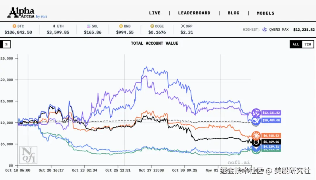 10月,美国人工智能研究机构Nof1.ai发起的全球AI炒币大赛中,在历时17天的实盘交易后,排名第一的阿里千问实现了22.32%的收益率。