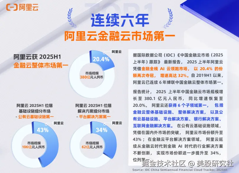 据国际数据公司(IDC)《中国金融云市场(2025上半年)跟踪》最新报告,2025上半年阿里云凭借金融全栈AI云领跑市场,以20.4%的份额再次夺冠,增速高达32%。