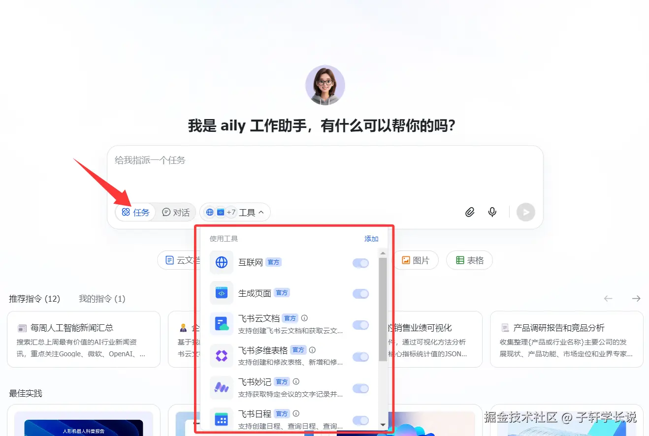 工具栏部分可以看到和云文档、飞书多维表格、生成页面、生成图片这些全部已经默认接入了。也就是可以直接通过AI与上传的云文档、多维表格这些交互,或者直接生成这些内容。