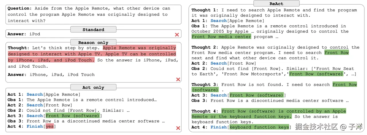 上图是 ReAct 论文中的一个示例,主要对比了 Standard、Reason Only、Act Only 以及 ReAct 四种不同范式在同一问题下的表现差异。Standard 方式直接给出答案,既不显式展开推理,也不与外部环境交互;Reason Only 虽然在回答前进行了逐步推理,但推理过程完全依赖模型自身的知识,一旦前提判断错误,结论便无法被外部信息纠正;Act Only 则能够多轮调用搜索等工具获取信息,但由于缺乏明确的推理指导,行动过程较为盲目,最终仍然得出了错误结果。相比之下,ReAct 通过多轮 Thought → Act → Observation 的交错执行,使模型能够在行动结果的反馈下不断修正推理路径,最终在后续轮次中得到正确答案。