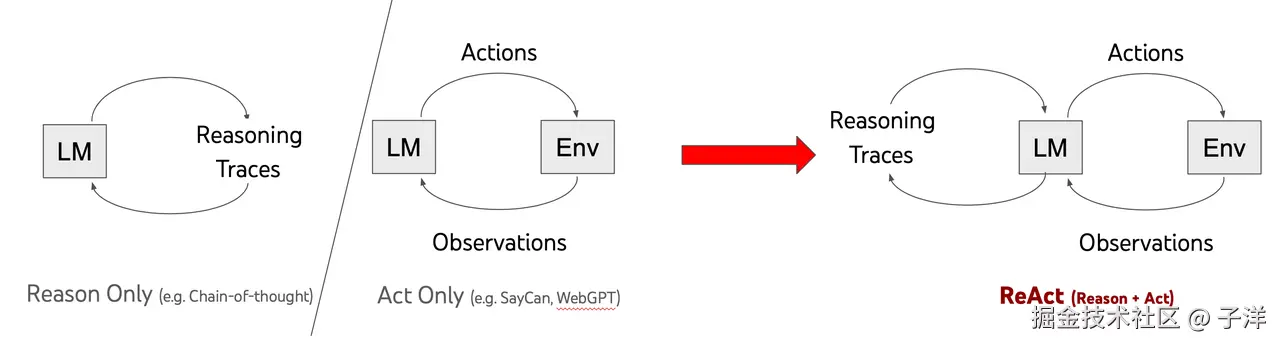 需要说明的是,这里的分类来自 ReAct 论文中的抽象对比,而并非对具体系统内部实现的严格学术归类。例如: