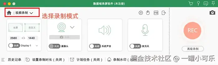 第1步:苹果怎么开录屏?启动数据蛙录屏工具,根据自身使用场景挑选合适的录制模式,本次演示将以基础款 “屏幕录制” 模式为参考;