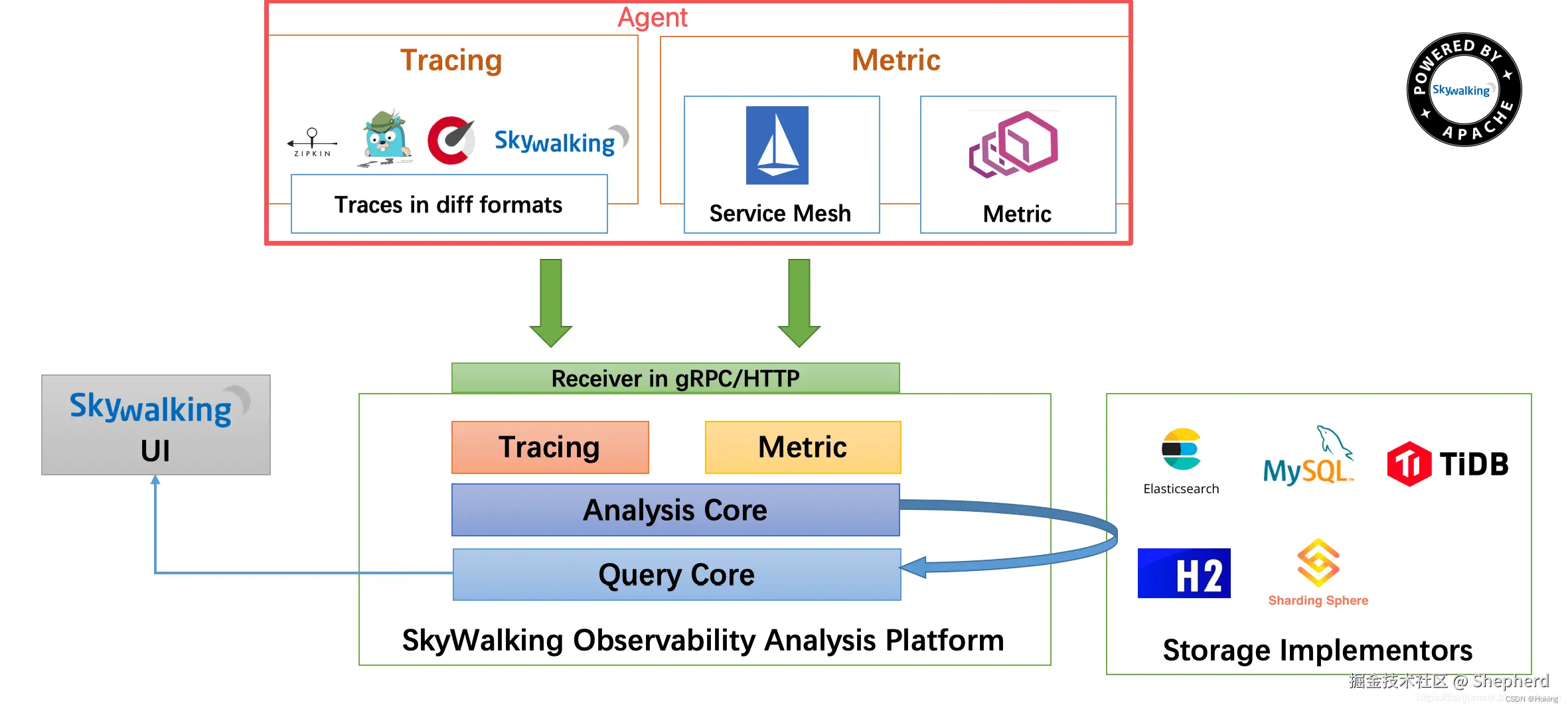 - OAP: 全称即图上的Observabilitiy Analysis Platform, 完成数据聚合, 数据分析以及驱动数据流从探针到用户界面的流程