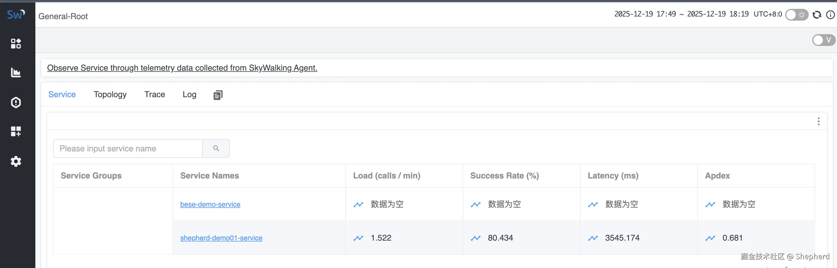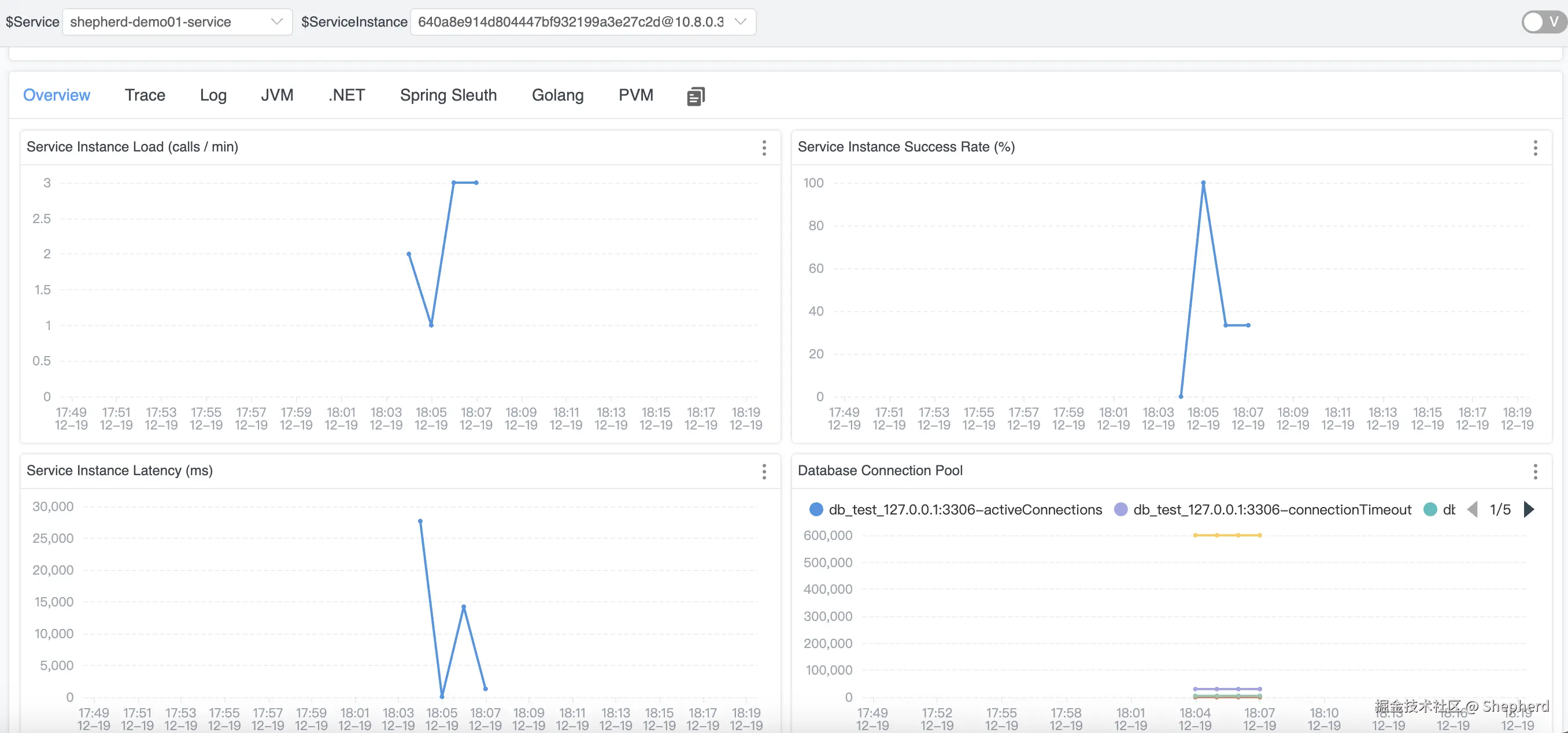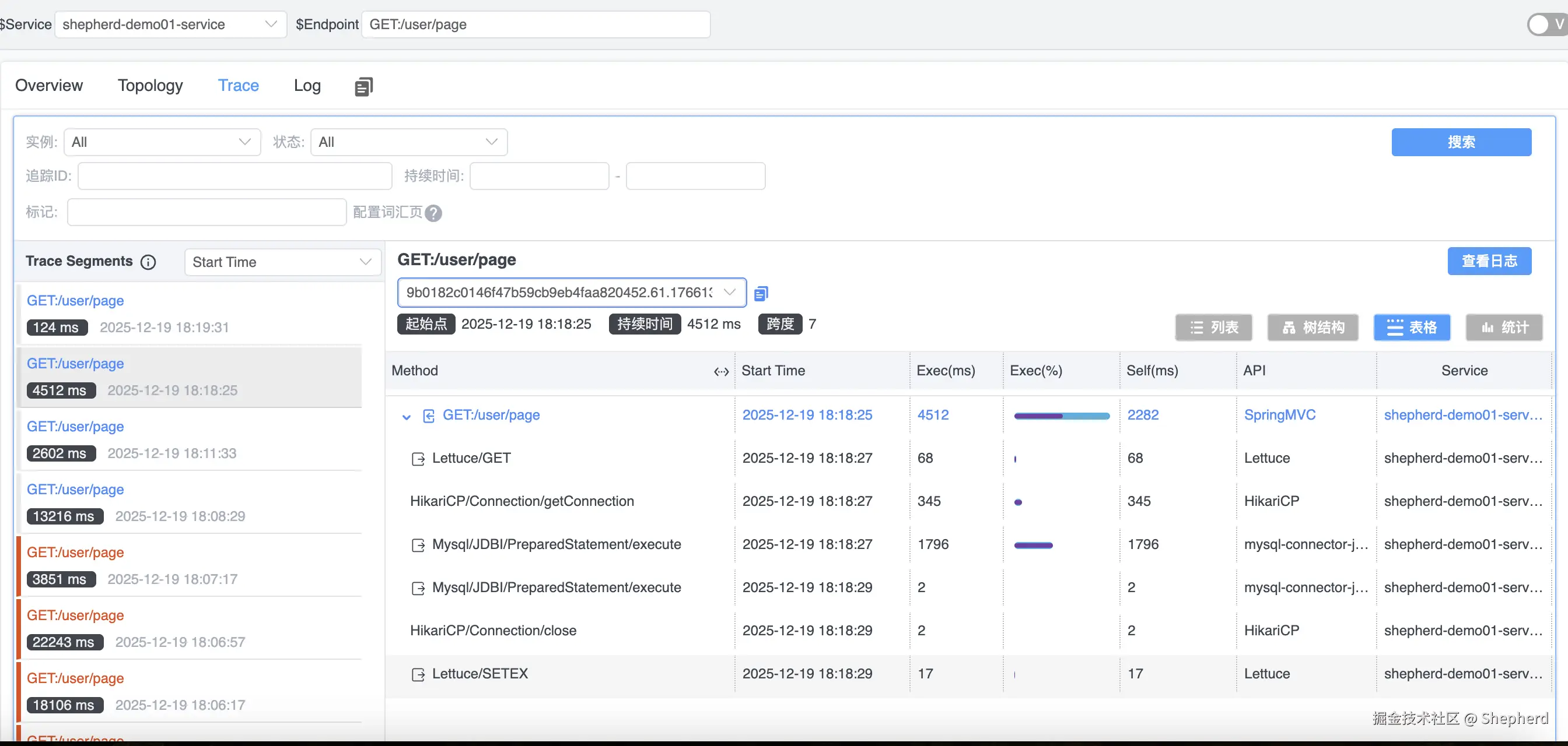 项目启动成功之后,Skywalking会监控到一个名为shepherd-demo01-service的服务,如上图所示。可看到对应的服务名称、实例、接口调用链路等信息