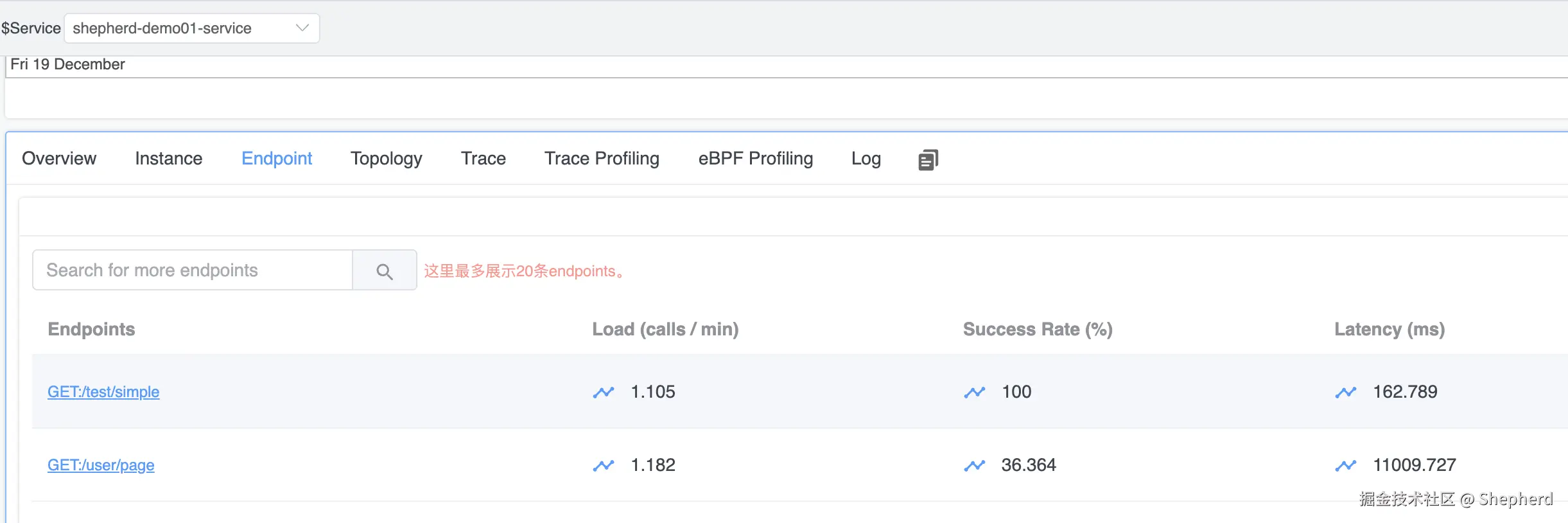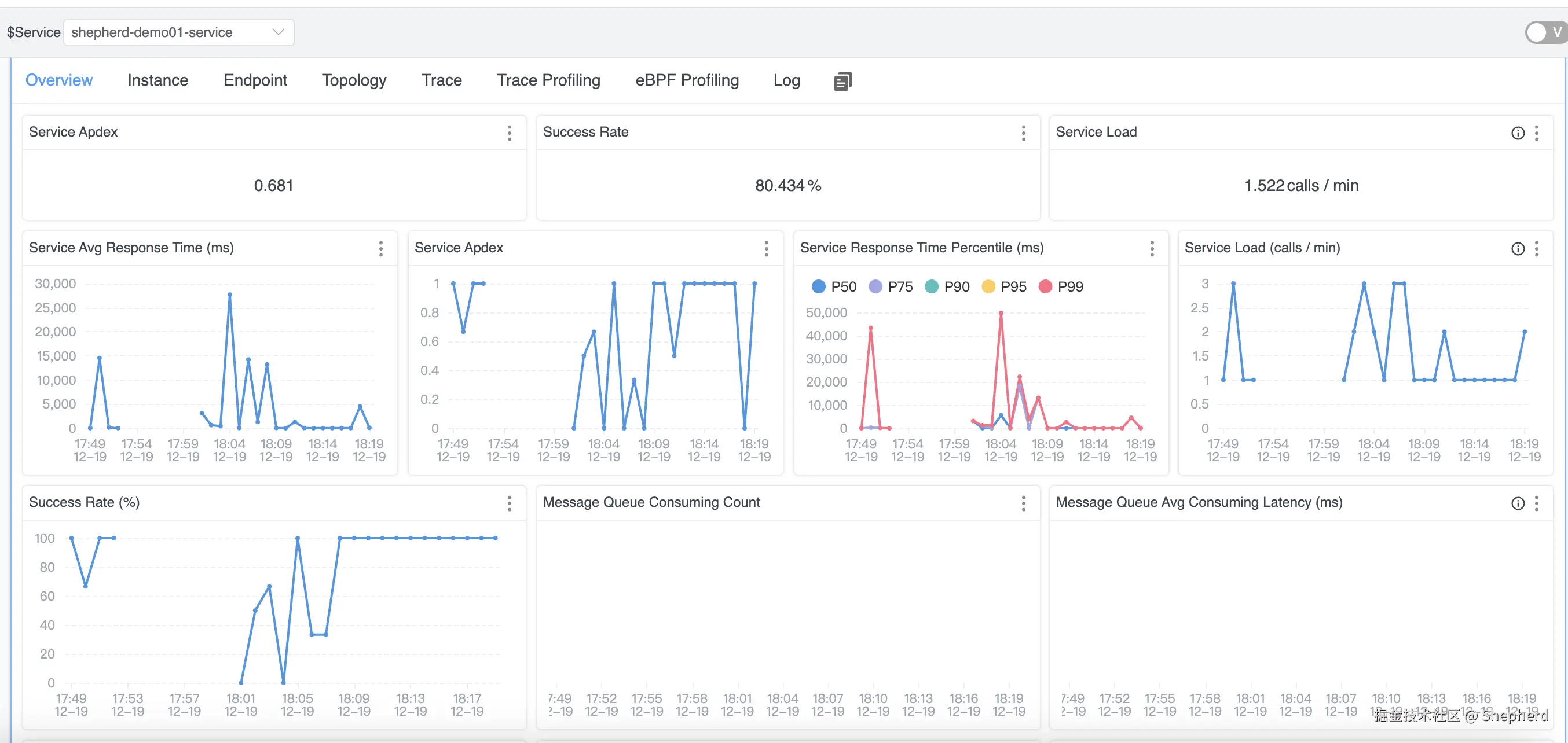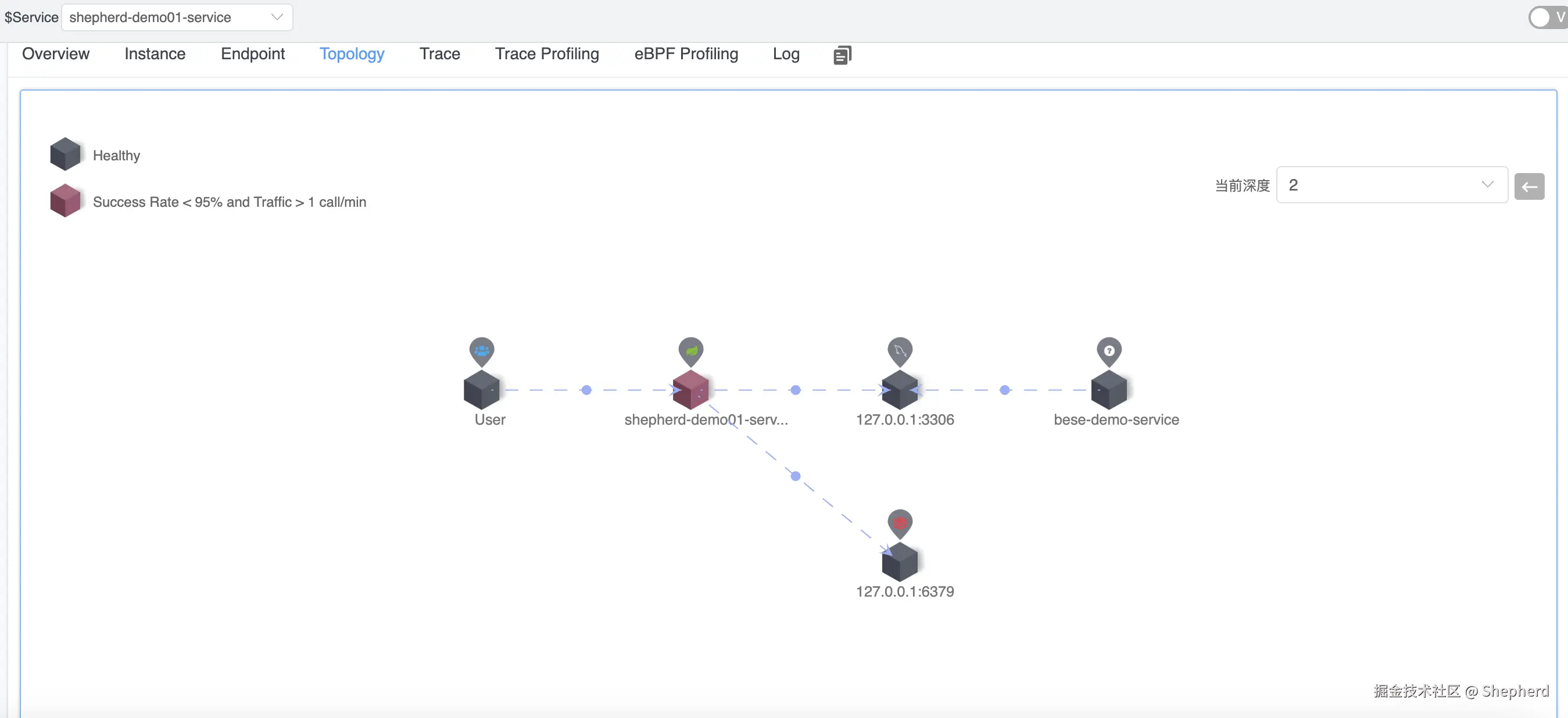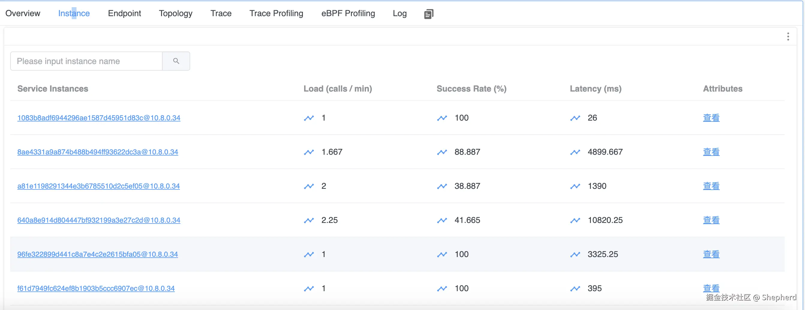 项目启动成功之后,Skywalking会监控到一个名为shepherd-demo01-service的服务,如上图所示。可看到对应的服务名称、实例、接口调用链路等信息
