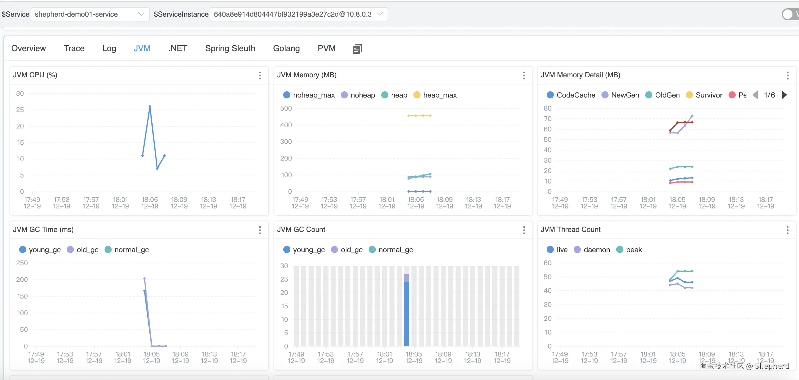 - 实例详情:查看实例下的监控指标信息,如JVM内存、CPU、GC等情况