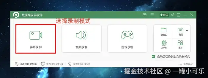 1、软件安装完毕并启动后,将显示多种录制模式选项,本教程以基础的 【屏幕录制】 模式作为演示案例;