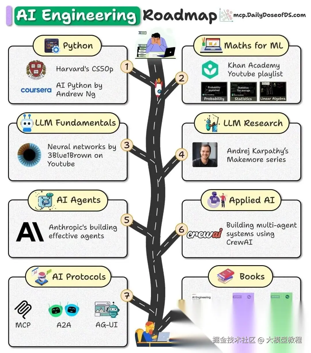 AI工程的学习逻辑是“从基础工具(Python)→ 核心技术(LLM、智能体)→ 系统协作(协议、多智能体)”,跟着这个路线逐步深入,能更高效地搭建知识体系~