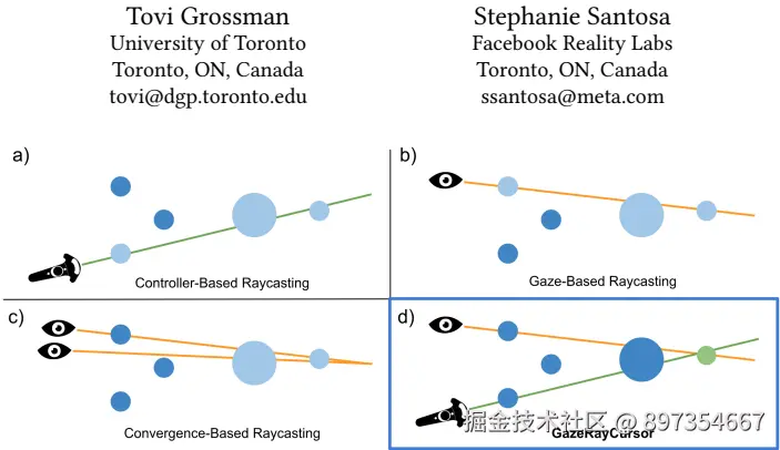 主要创新:提出了GazeRayCursor,首次将注视射线和控制器射线的“投影交点”用于VR深度估计,解决了选择模糊问题。