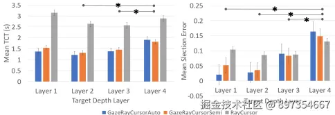 - 错误率低:在近距离层(1-3米),错误率显著低于RayCursor;但远距离层(4米)稍高,因注视估计精度下降。