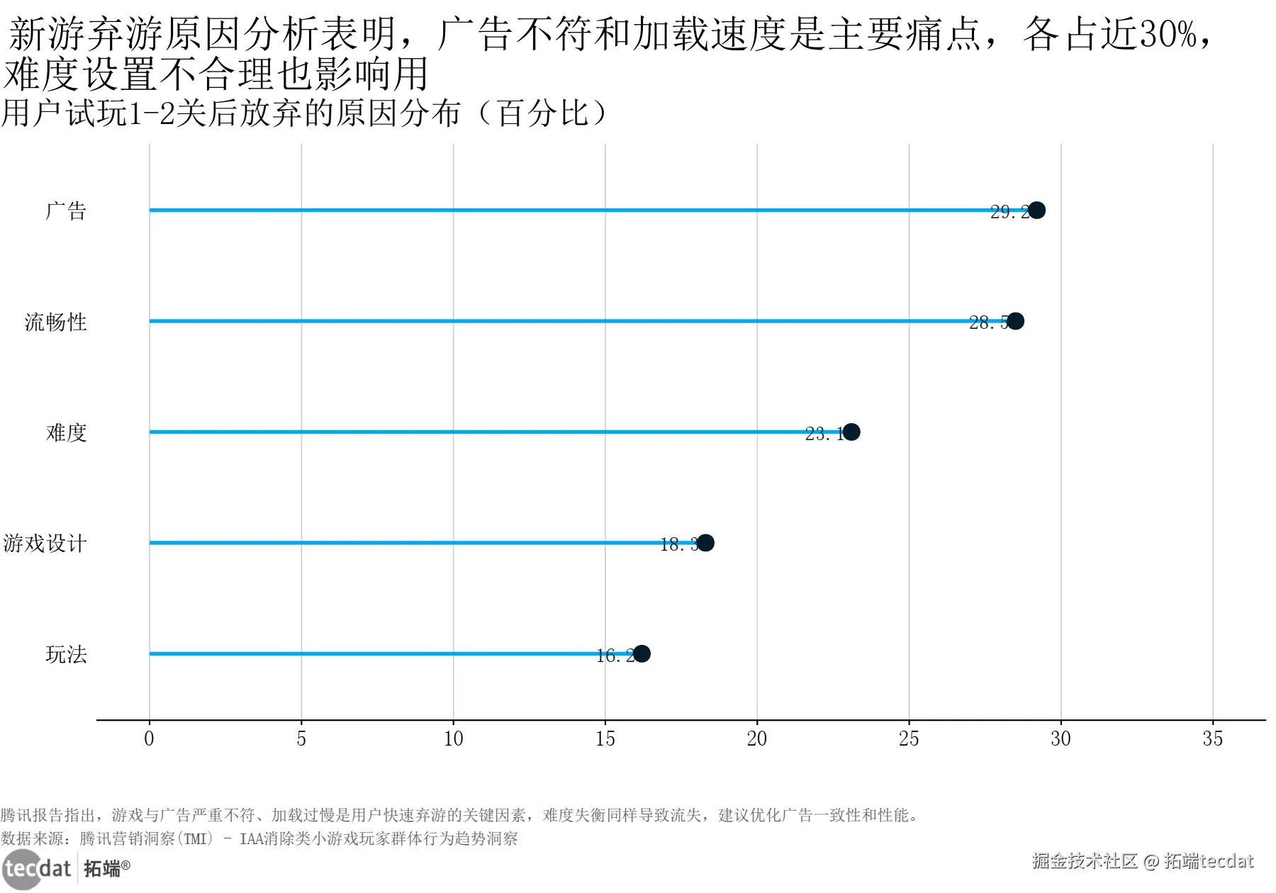 3秒解读:难度失衡(45.0%)是首要弃游原因,广告不符(29.2%)、加载缓慢(28.5%)分列二三位,体验痛点直接影响用户留存。