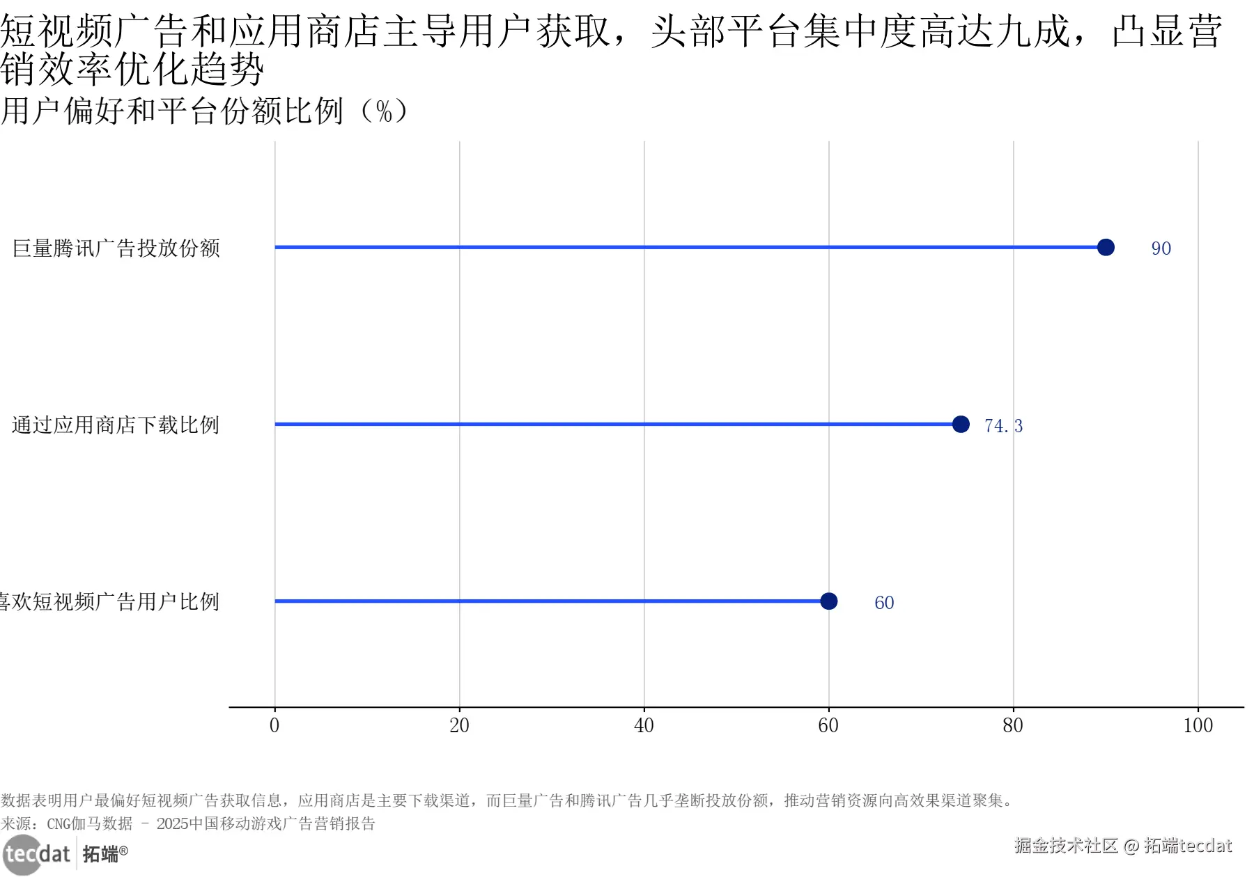 3秒解读:74.3%的用户通过应用商店下载游戏,60%偏好短视频广告,巨量+腾讯广告占据90%投放份额,渠道集中度极高。