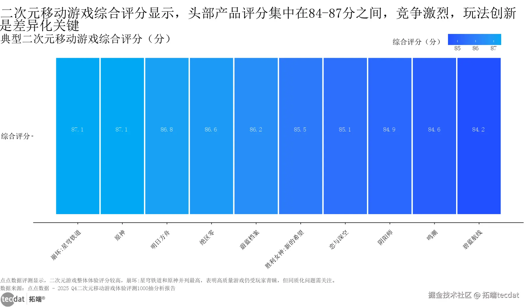 3秒解读:崩坏:星穹铁道与原神并列第一(87.1分),头部产品评分差距不足3分,品质内卷成为行业常态。