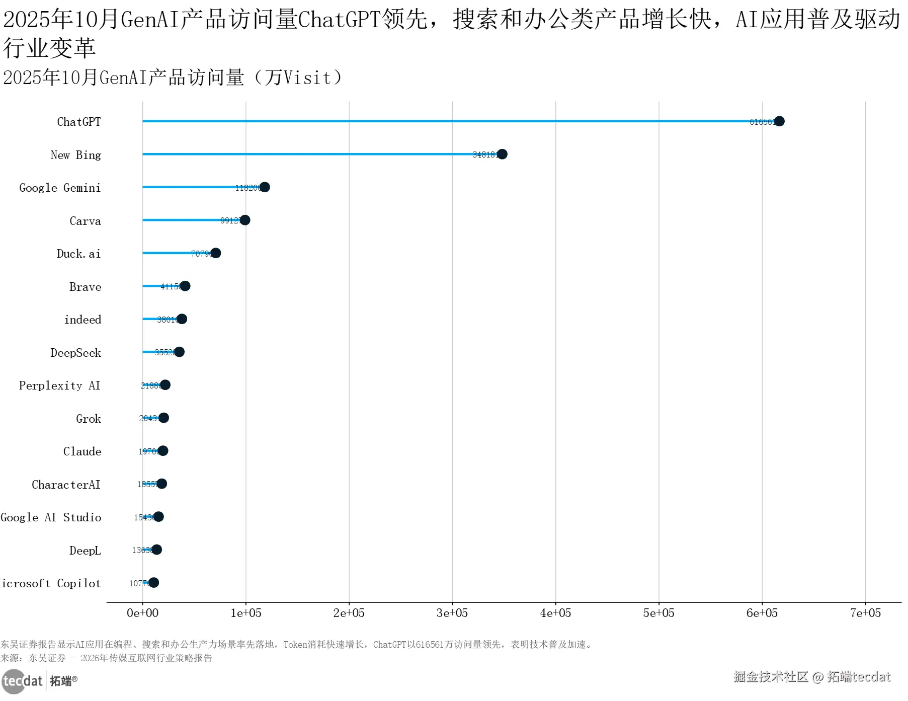 3秒解读:ChatGPT以616561万访问量领跑市场,是第二名New Bing(348181万)的1.8倍,搜索与办公类AI工具成为行业应用热点。