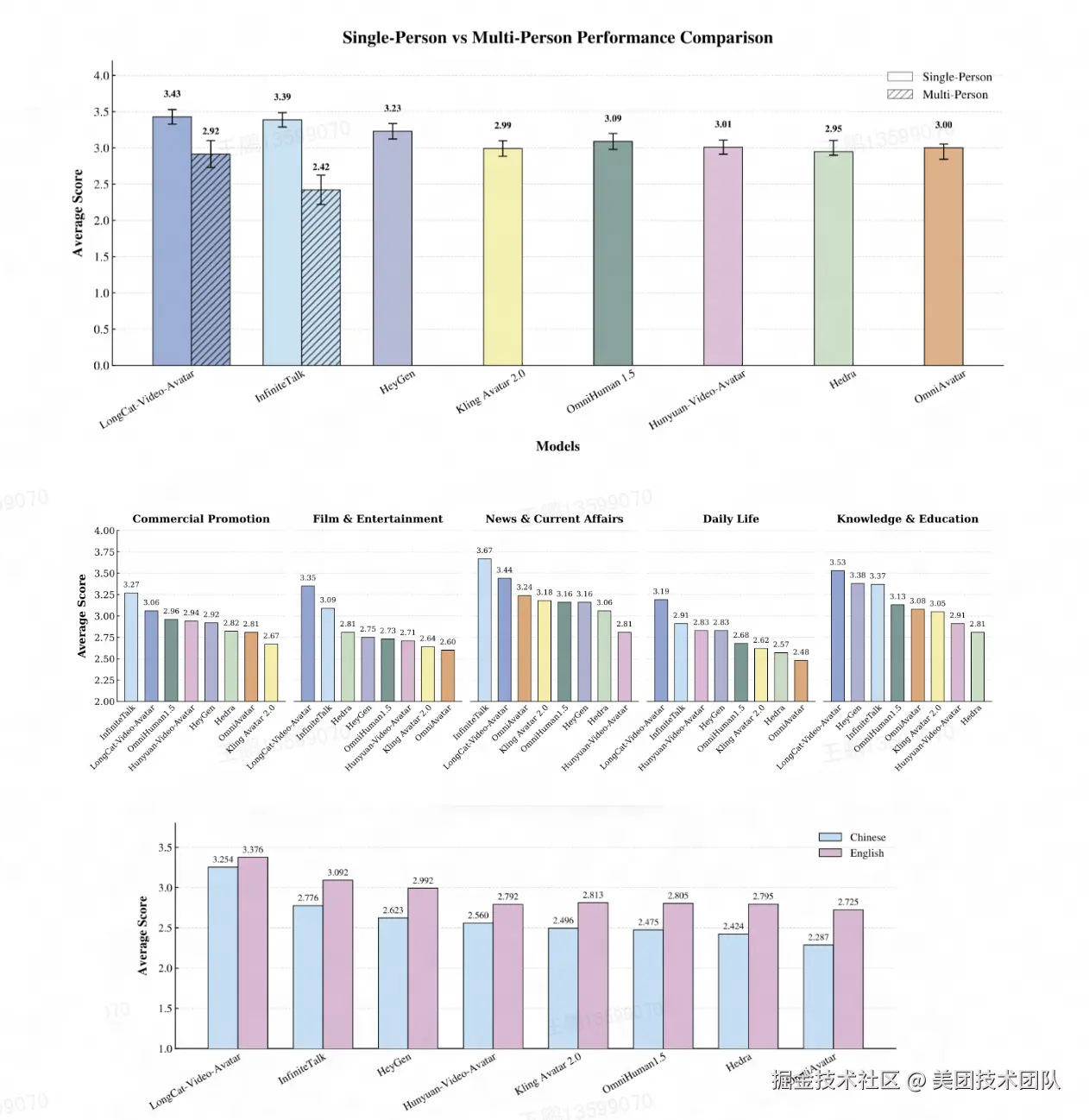 - 语言表现:LongCat-Video-Avatar 在中文和英文语言中均优于所有对比方法,体现出稳健的跨语言性能和精准的音画同步效果;