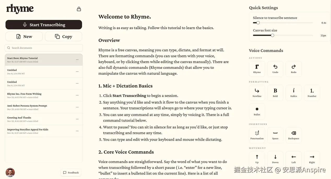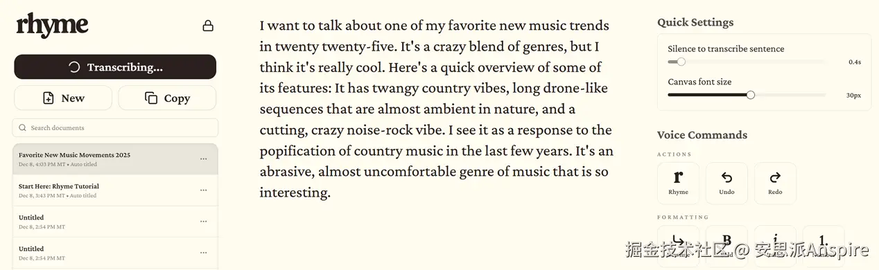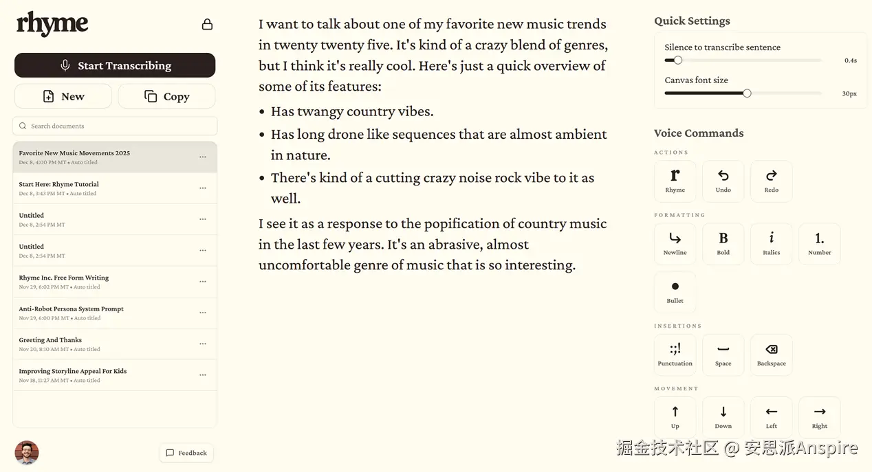 我可以说话,Rhyme会在我说话时插入我的句子。我还可以通过语音命令添加空格、项目符号和各种其他格式: