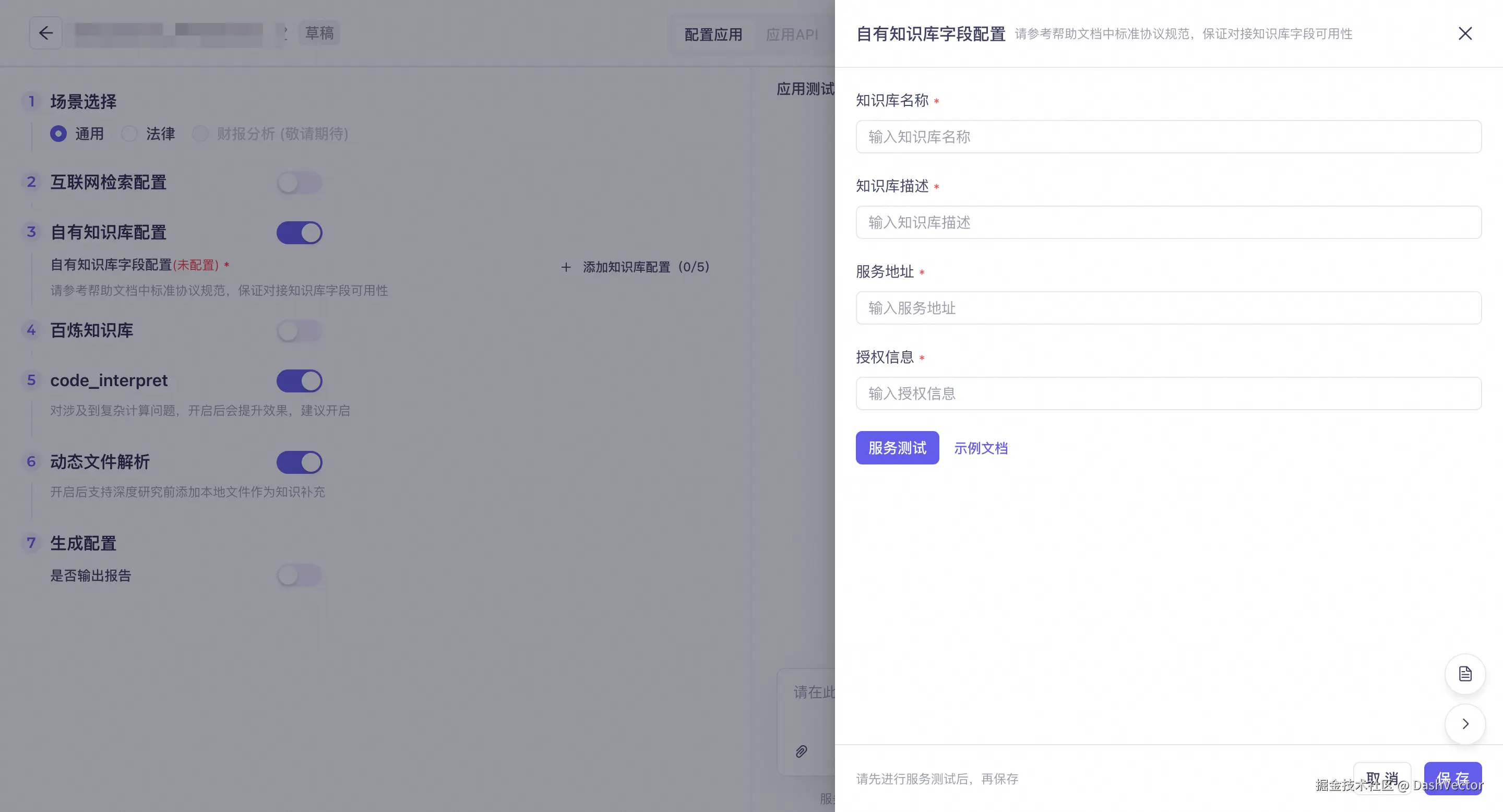输入知识库名称、知识库描述、服务地址、授权信息,点击“服务测试”,验证通过后点击“保存”以完成添加。可参考示例文档进行知识库对接配置。