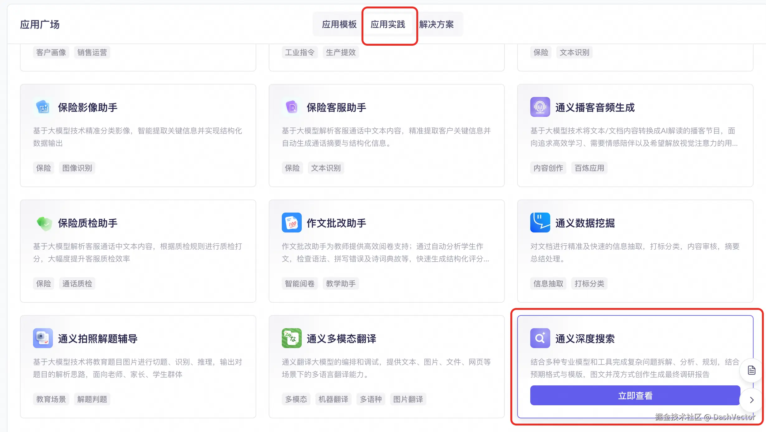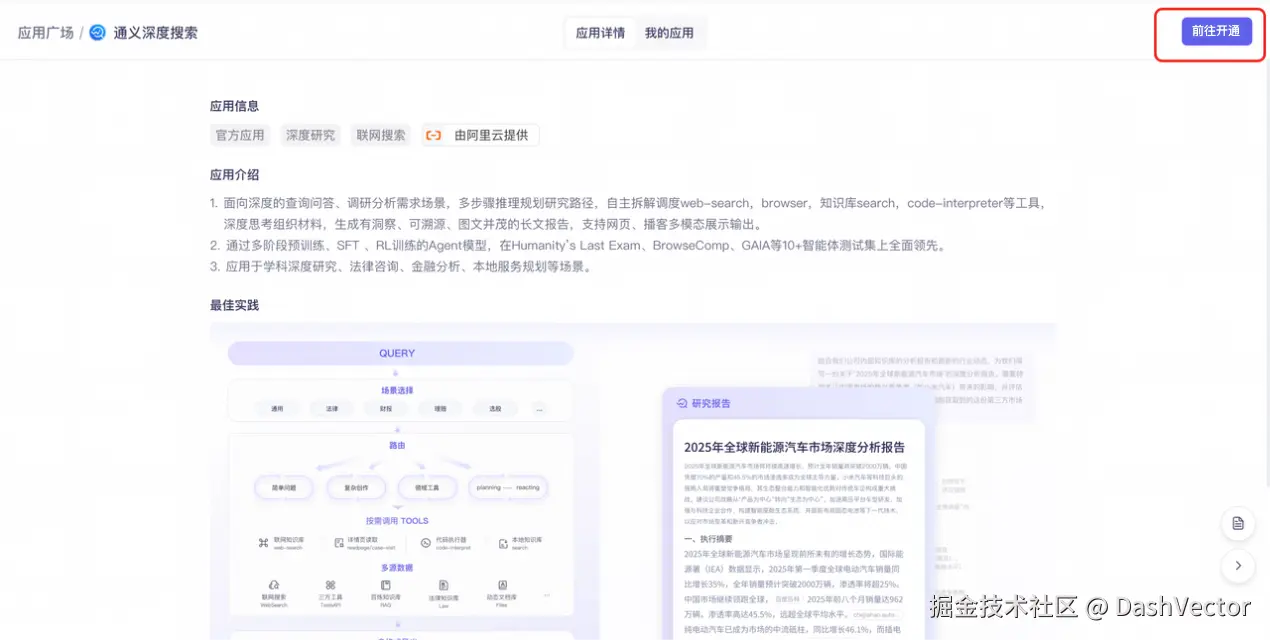 1.在阿里云百炼控制台的应用广场中点击通义深度搜索卡片,进入应用详情。