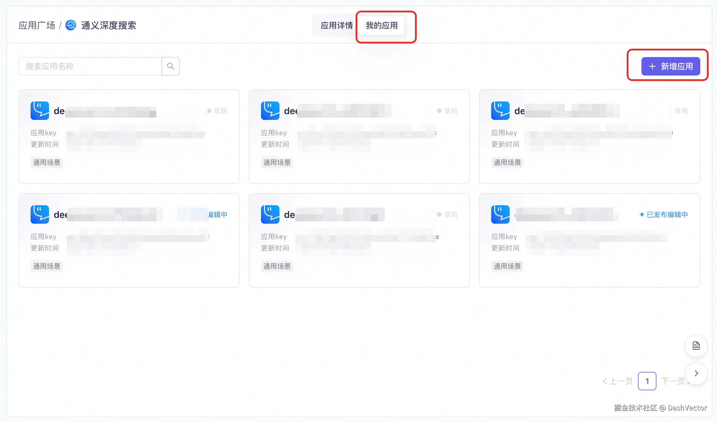 点击我的应用进入应用管理页面。页面展示所有已创建的应用和应用key等信息,首次使用需要新增应用。