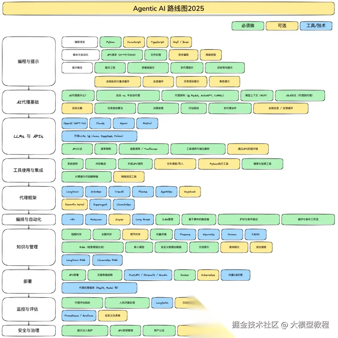 今天,我们将通过一份2025年AI Agent开发路线图,全面解析Agent开发领域的核心技术栈和发展路径。