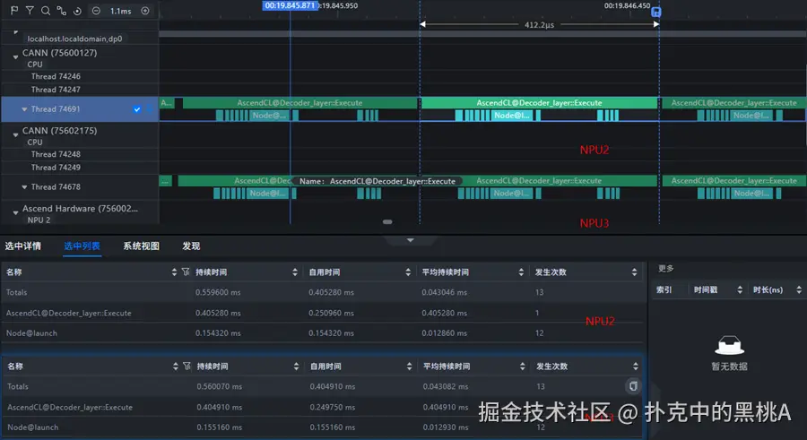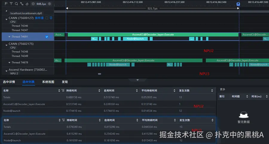 在大模型推理或训练场景中,NPU 与 CPU 间通信极为频繁。 当中断发生在业务线程所在的 CPU 核上时,推理过程会被频繁打断。Profiling 结果通常表现为: