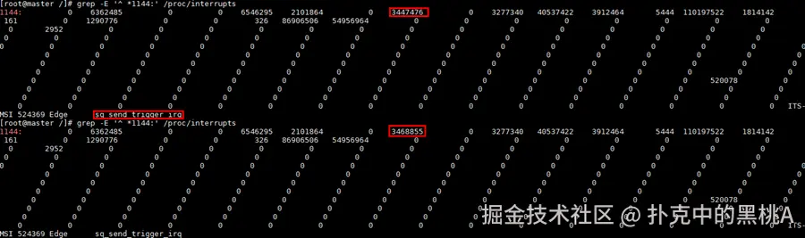 在实际大模型推理环境中,你可以通过 cat /proc/interrupts 实时观察到某些中断(例如 sq_send_trigger_irq、cq_update_irq)在某几个 CPU 上触发频率极高。 这通常说明这些中断源被固定绑定在特定 CPU 核上,如果你的推理线程也恰好绑定在同一核,就会造成频繁的中断抢占,进而引起 HostBound 性能瓶颈。