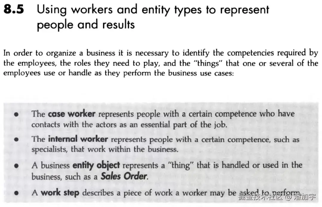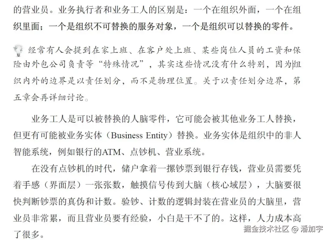 但是,把订单(不管是一份纸质订单还是软件系统里的一个"订单"对象)当成业务实体,然后和业务工人并列,是不合适的。员工和其他员工协作、员工和软件系统协作可以,员工和一张纸协作、员工和某个软件系统里的一个“员工”对象协作说不通。