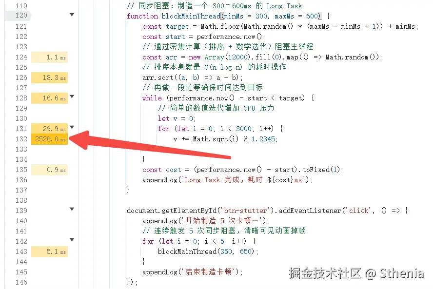 在新版的 chrome 中,甚至可以看到每段代码的具体耗时,点击 blockMainThread 右侧的源码就可以看到: