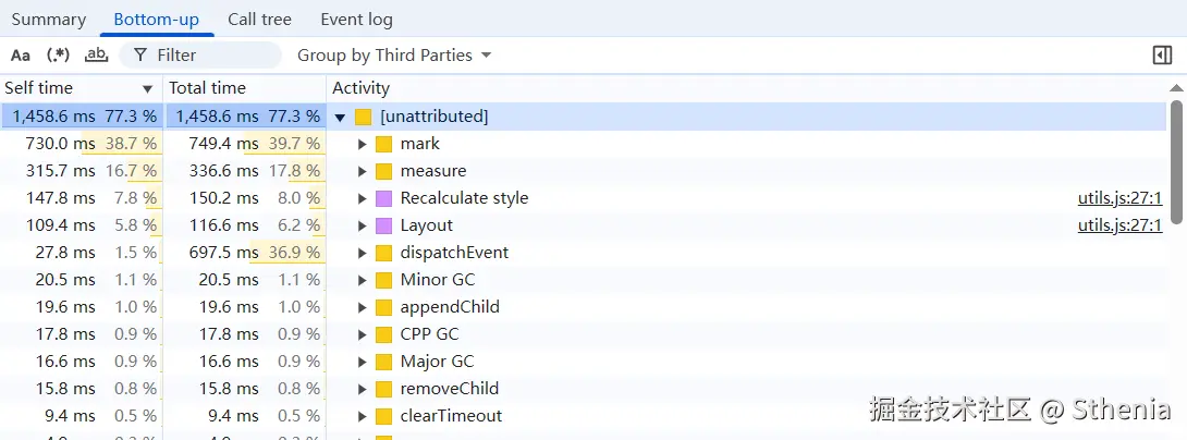 在 bottom-up 中,确实还有大量的其他内建 api 耗时,比如,Minor GC,appendChild。