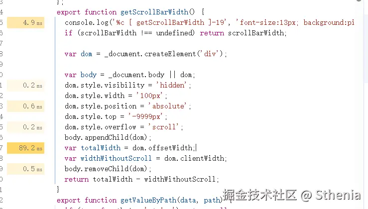 虽然定位到 getScrollBarWidth 方法引起的,并且具体是计算 dom 宽度引起的卡顿,但是只是执行计算理应不会导致页面卡顿,是不是还是其他原因导致的卡顿?