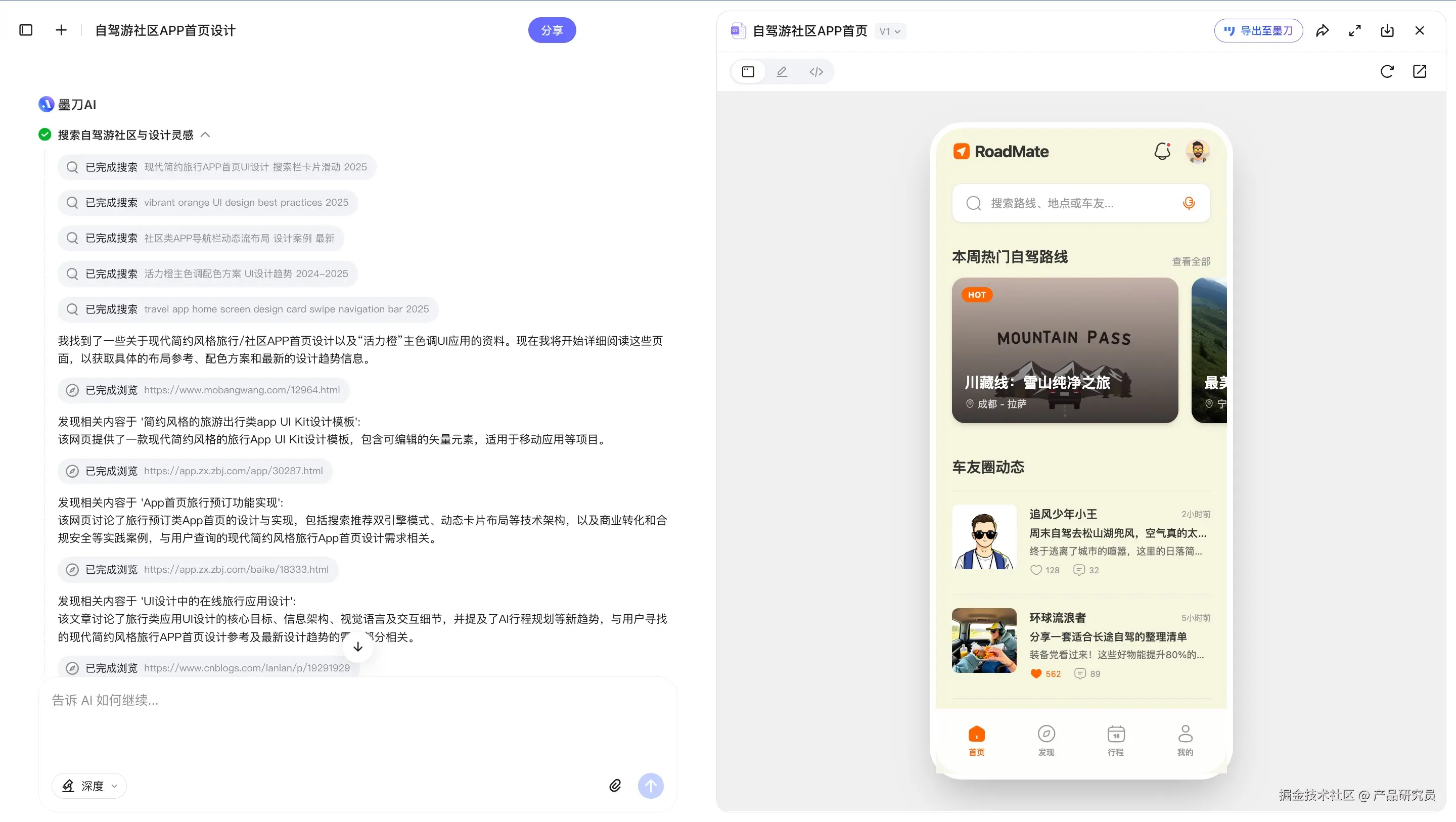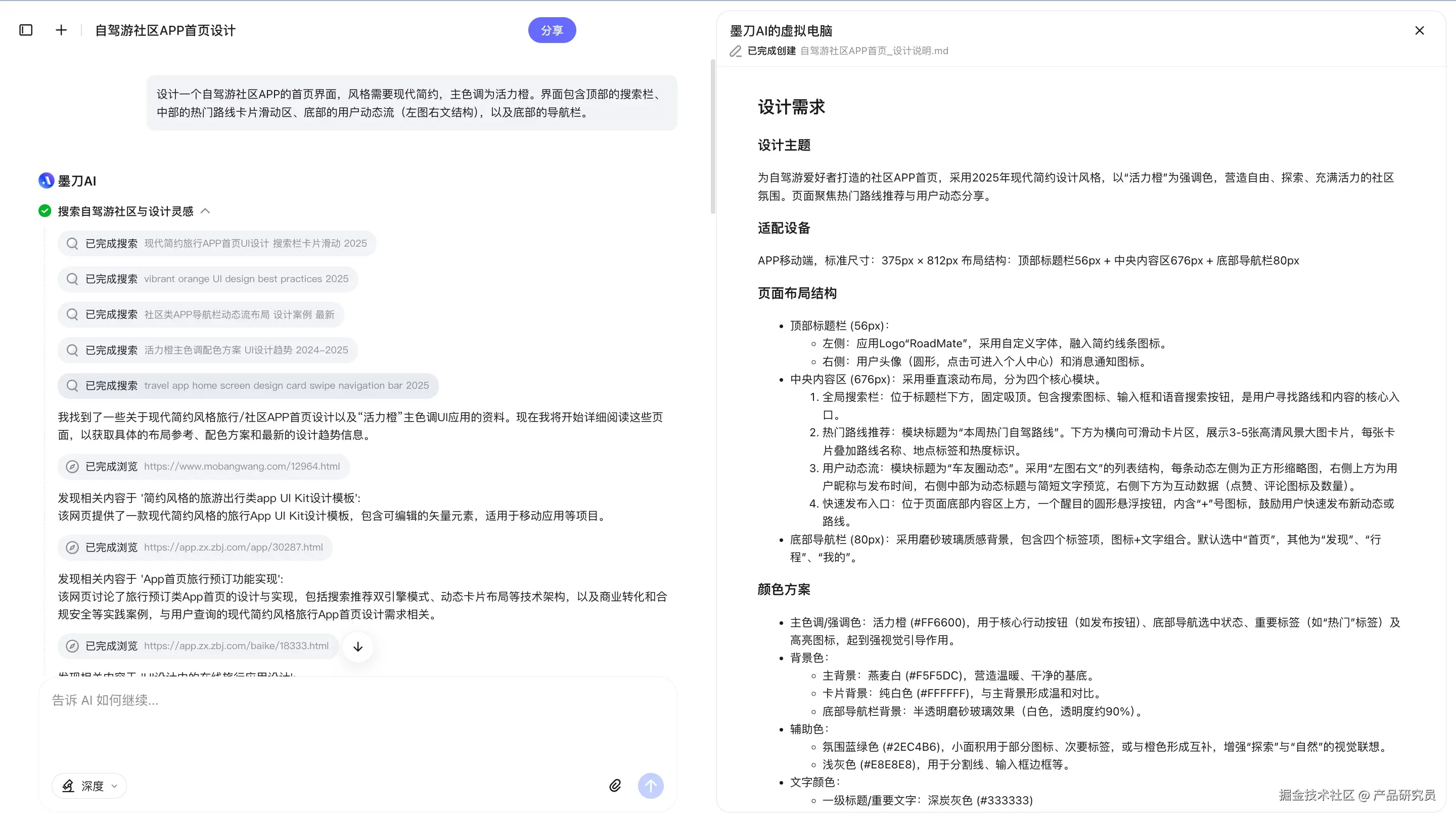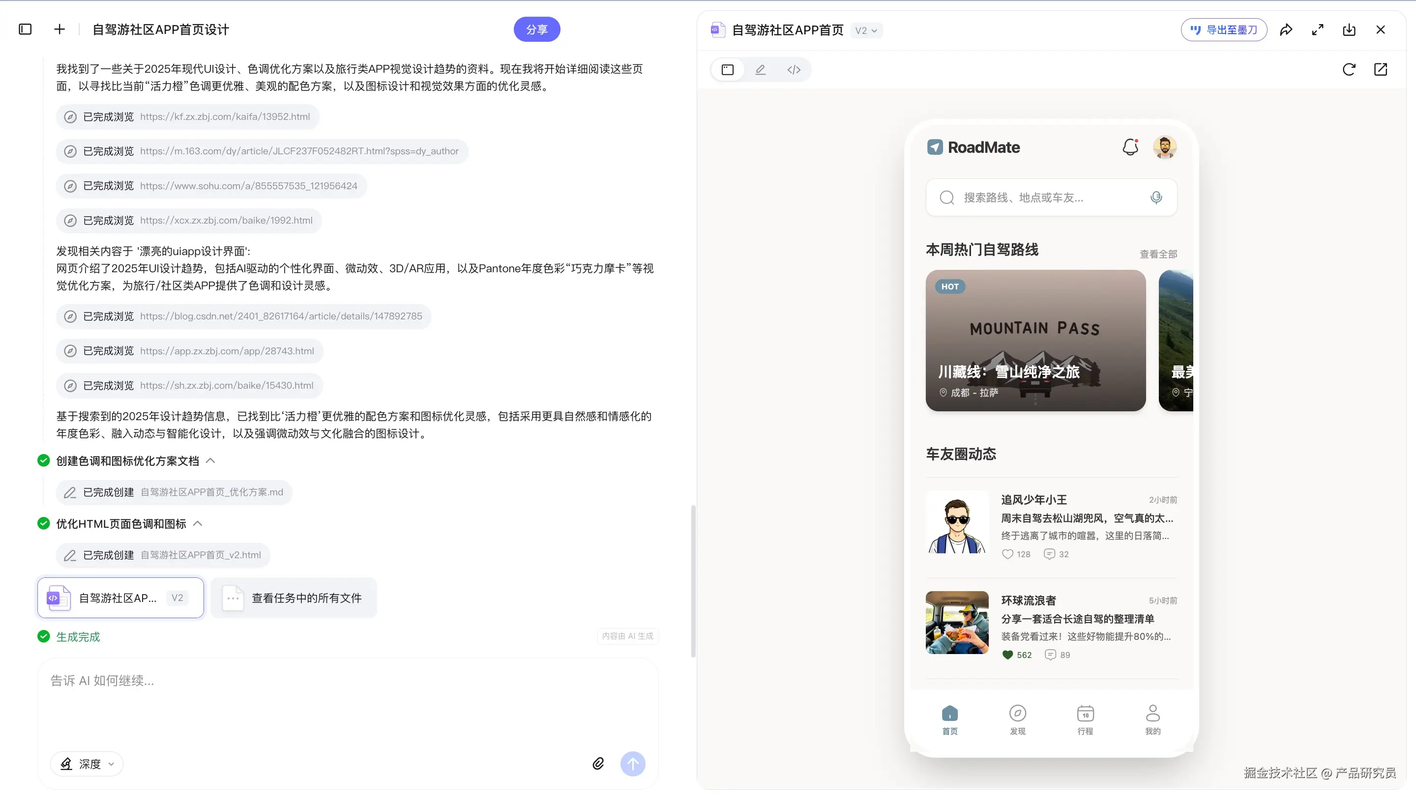 接收到指令后,AI有一整个处理流程:它先搜索自驾游社区与设计灵感,找到了一些布局参考和设计趋势的信息,生成了一份设计说明文档,并根据文档生成了APP首页。