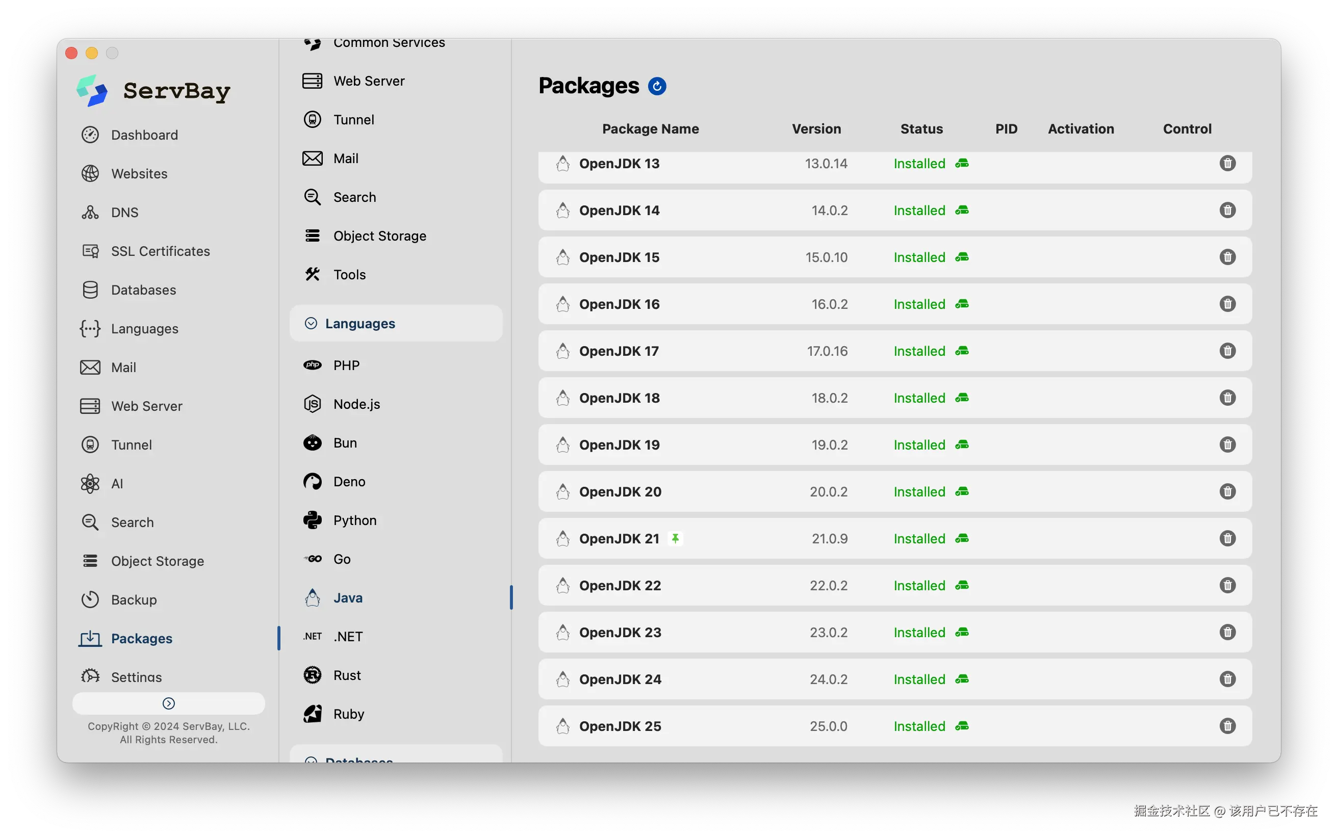 ServBay 为开发者提供了一个一体化的解决方案,它不仅支持**一键安装Java**,更重要的是解决了版本共存的痛点。在ServBay中,我们可以实现不同版本的Java同时并存,无论是维护老旧的Java 8项目,还是探索Java 21的新特性,都能在同一台机器上流畅切换,互不干扰。