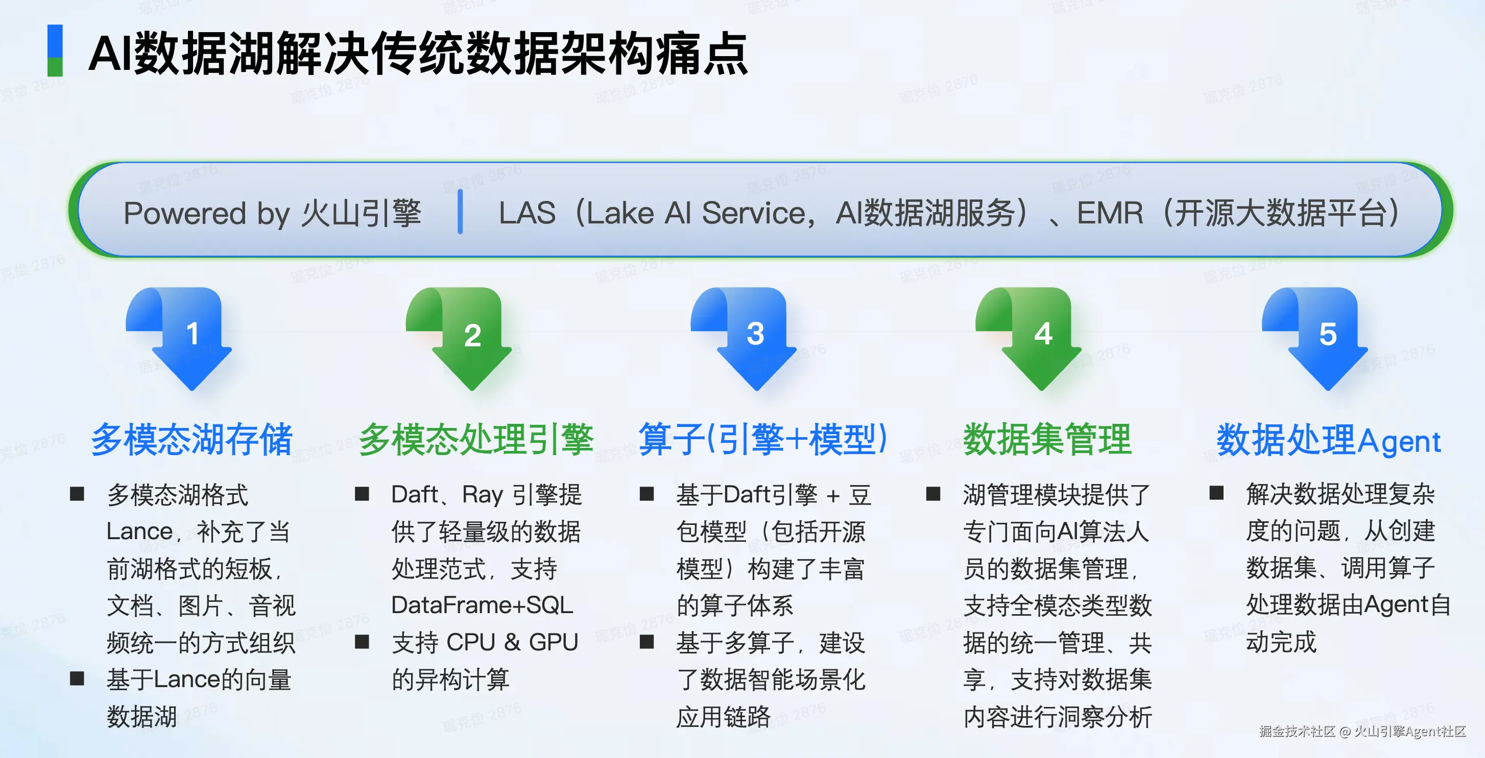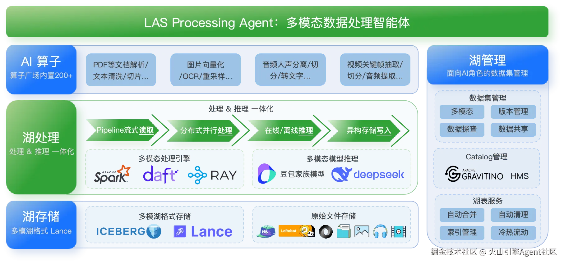LAS AI 数据湖产品是火山引擎为企业适应AI Agent时代推出的新一代多模态场景解决方案,孵化于字节跳动大模型训练场景,面向多模态数据场景,提供湖存储、湖管理、湖计算三大能力、通过“湖存储Lance+湖计算Daft”为核心要素,针对性解决视频、图片等非结构化数据处理的痛点。