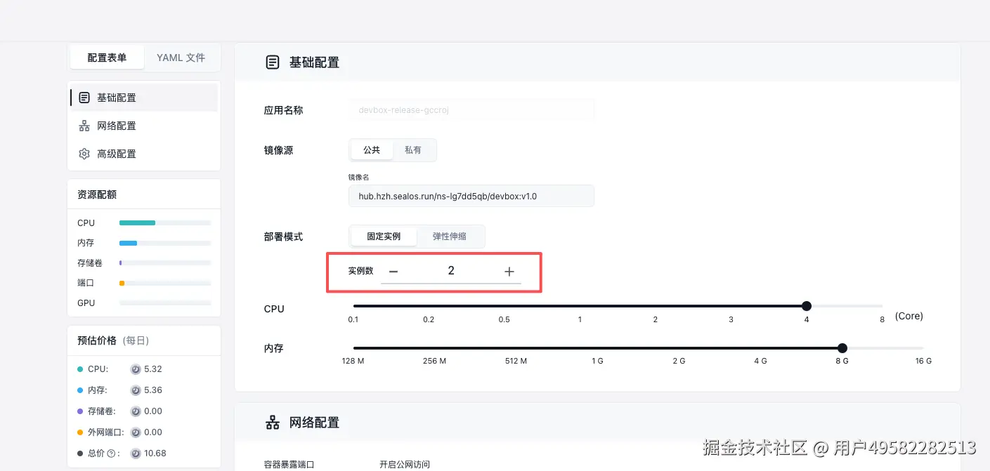 my-team/my-api:latest;在下方的图形界面里,我设置了容器需要暴露的端口号3000,通过滑块调整了 CPU 和内存的配额,最后点了一下「部署」。几十秒后,我的后端服务就成功运行了,全程没有碰一下终端。
